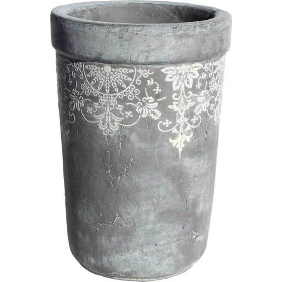 The tall cylindrical pot features a light and dark gray background with a white swirl and floral embellished design under the lip. It has a slightly worn and weathered appearance to give it the look that it's been well used and loved for years, yet it will stay sturdy for years to come. Thanks to its fabulous design and colouring, this pot is excellent to use in spring as well as year round whether you use it indoors or out. It comes in three different sizes, you can easily mix and match.