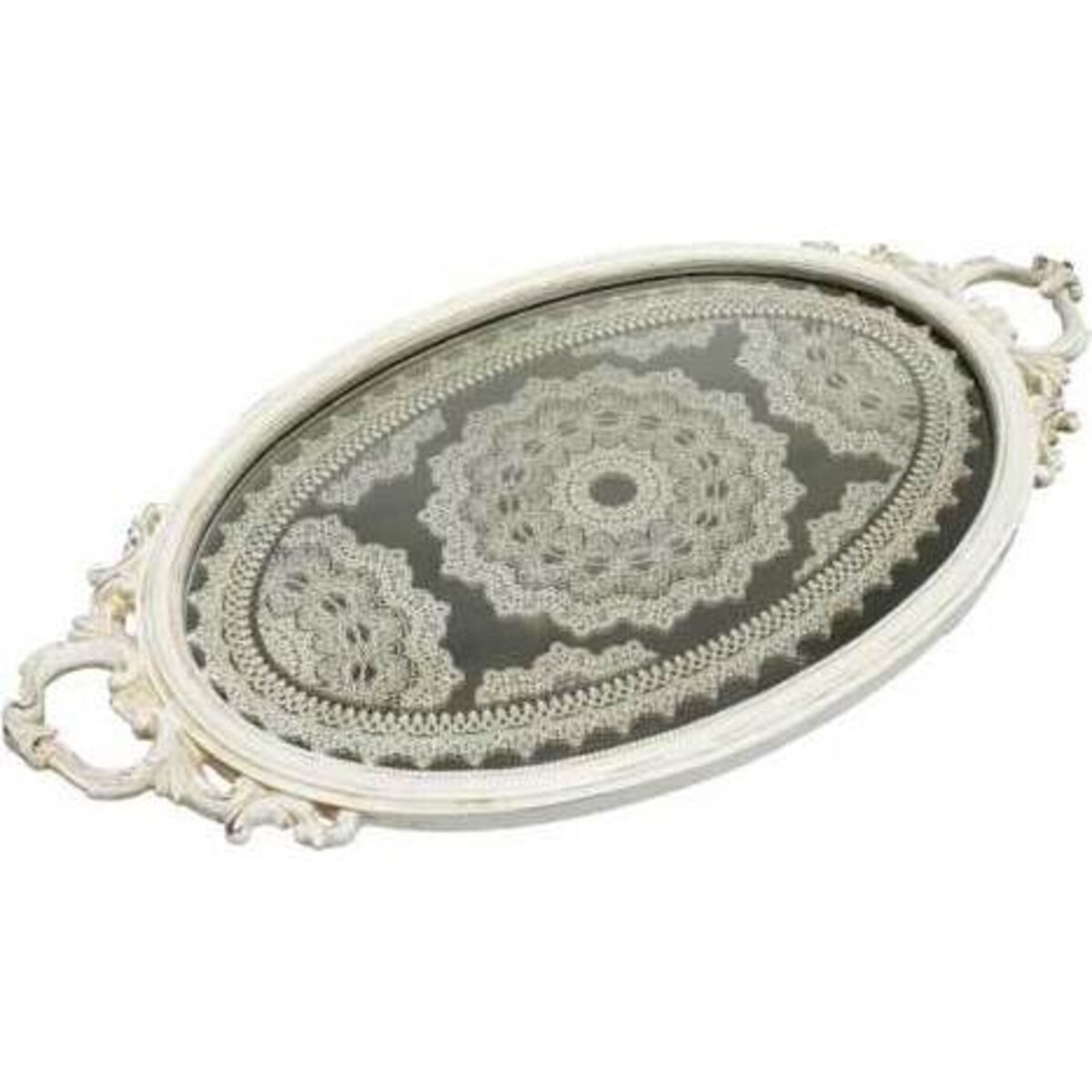 These trays aren't the standard trays you're used to; they're works of art. The white oval trays consist of exquisitely designed handles on either end that provide a huge dose of beauty while also allowing for easily transporting the trays from one place to another. The mirrored area at the centre features incredible etched designs that really make the decorative accents stand out. They're as great to use on a daily basis as they are for special occasions, such as a wedding, and they make wonderful gifts to give to all the special people in your life.