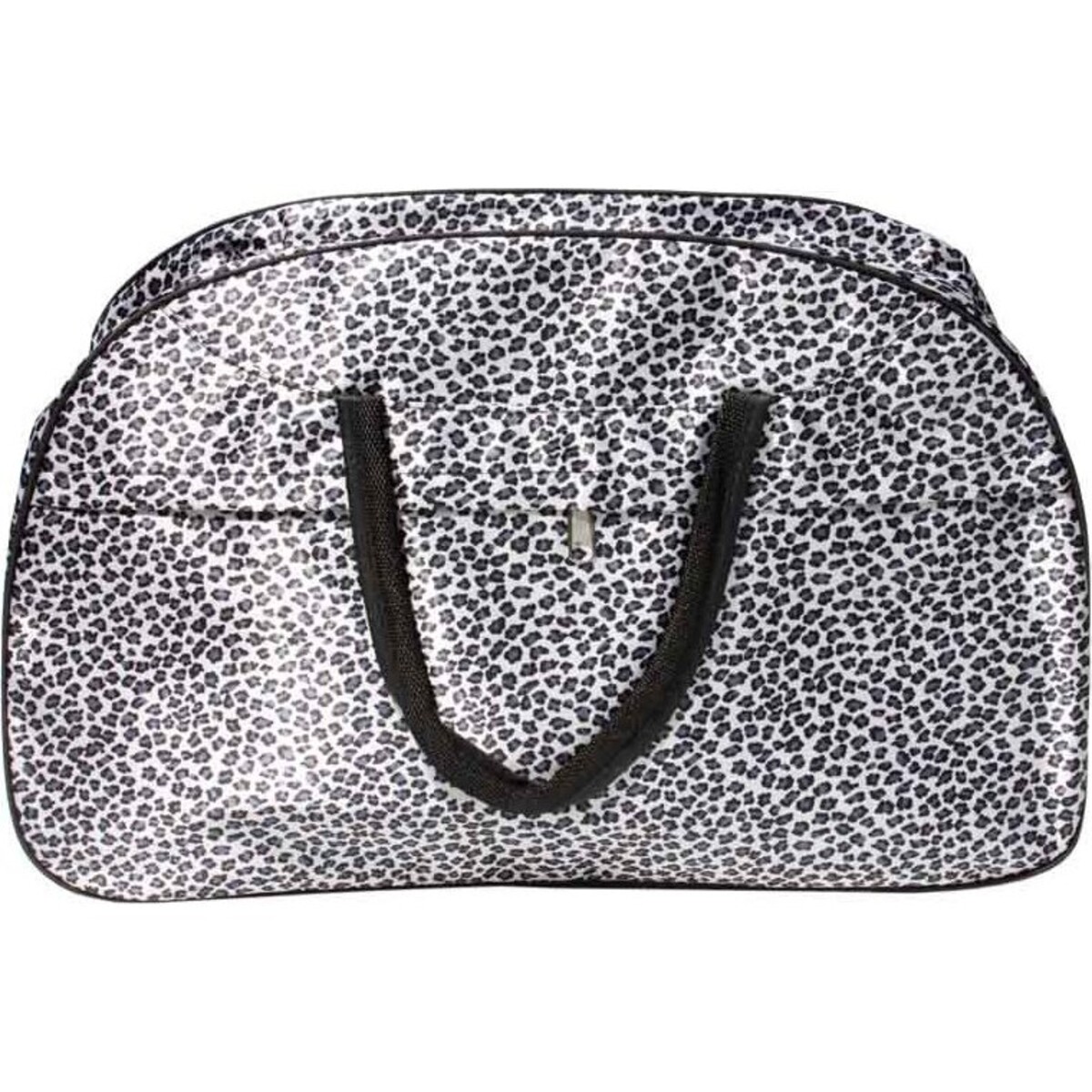 This is a small leopard print of black and some brown on a white polyester background. It is edged in black thread and has many fine lines and details. The zippers a silver colour and move parallel to the length of the overnight bag. It has the appeal of a leopard print without being too over the top. The bag is great for packing for weekend trips. It has a bowling ball carrier shape that can be carried with the hands or shoulders. The straps are black and made of the same polyvinyl material as the bag. There is a large double zipper pocket on the front of the tote that can be used for storage. The main compartment of the overnight bag is also joined together by means of a zipper.