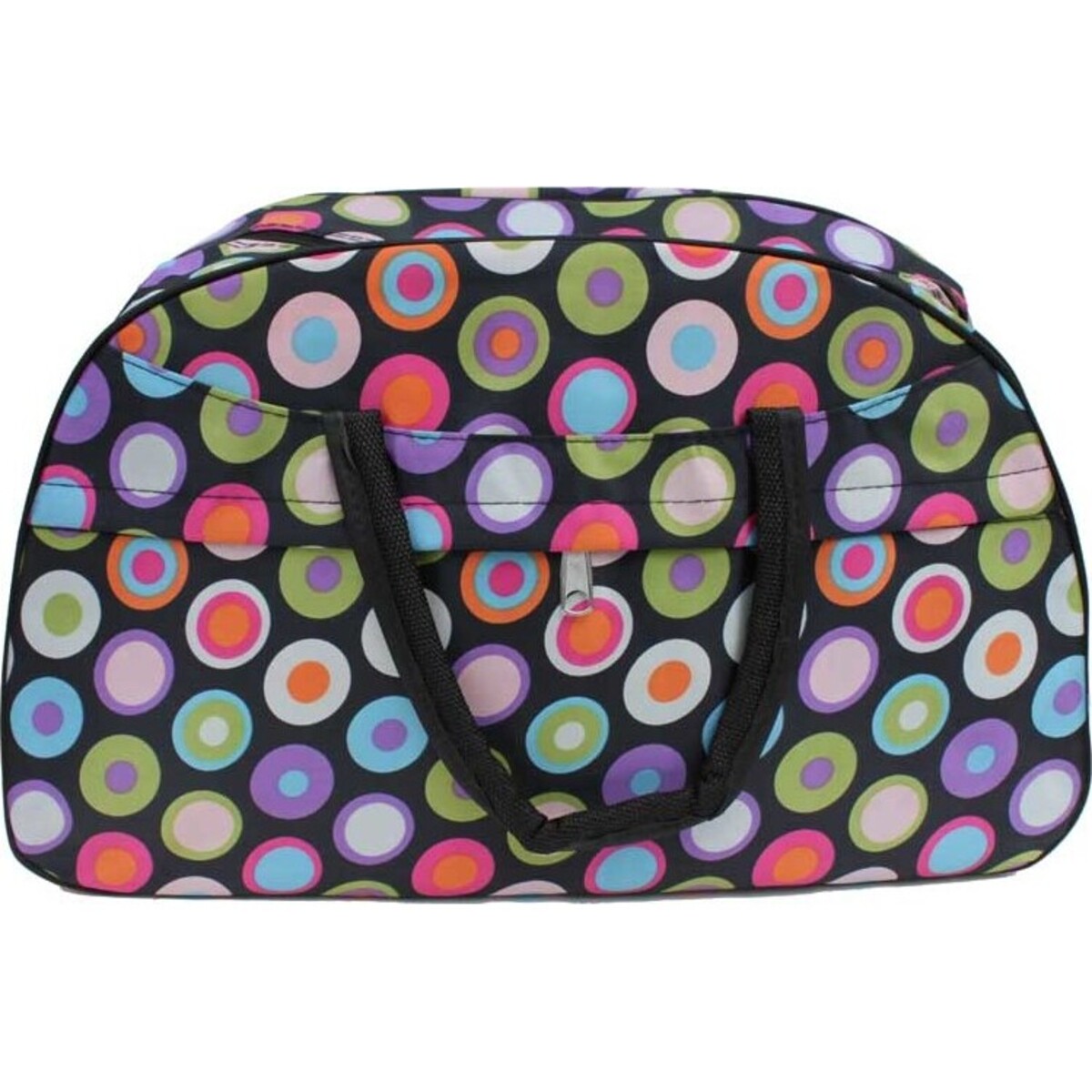 It is unclear whether or not this modern and colourful pattern was named after the mental disorder or vice versa. Nevertheless you are not delusional for this adorable folie overnight bag really is available for wholesale. The folie spots consist of two or more coloured circles of green, pink, blue, and orange on black. The overnight bag is great for packing for weekend trips. It has a bowling ball carrier shape that can be carried with the hands or shoulders. The straps are black and made of the same polyvinyl material as the bag. There is a large double zipper pocket on the front of the tote that can be used for storage. The main compartment of the overnight bag is also joined together by means of a zipper.
