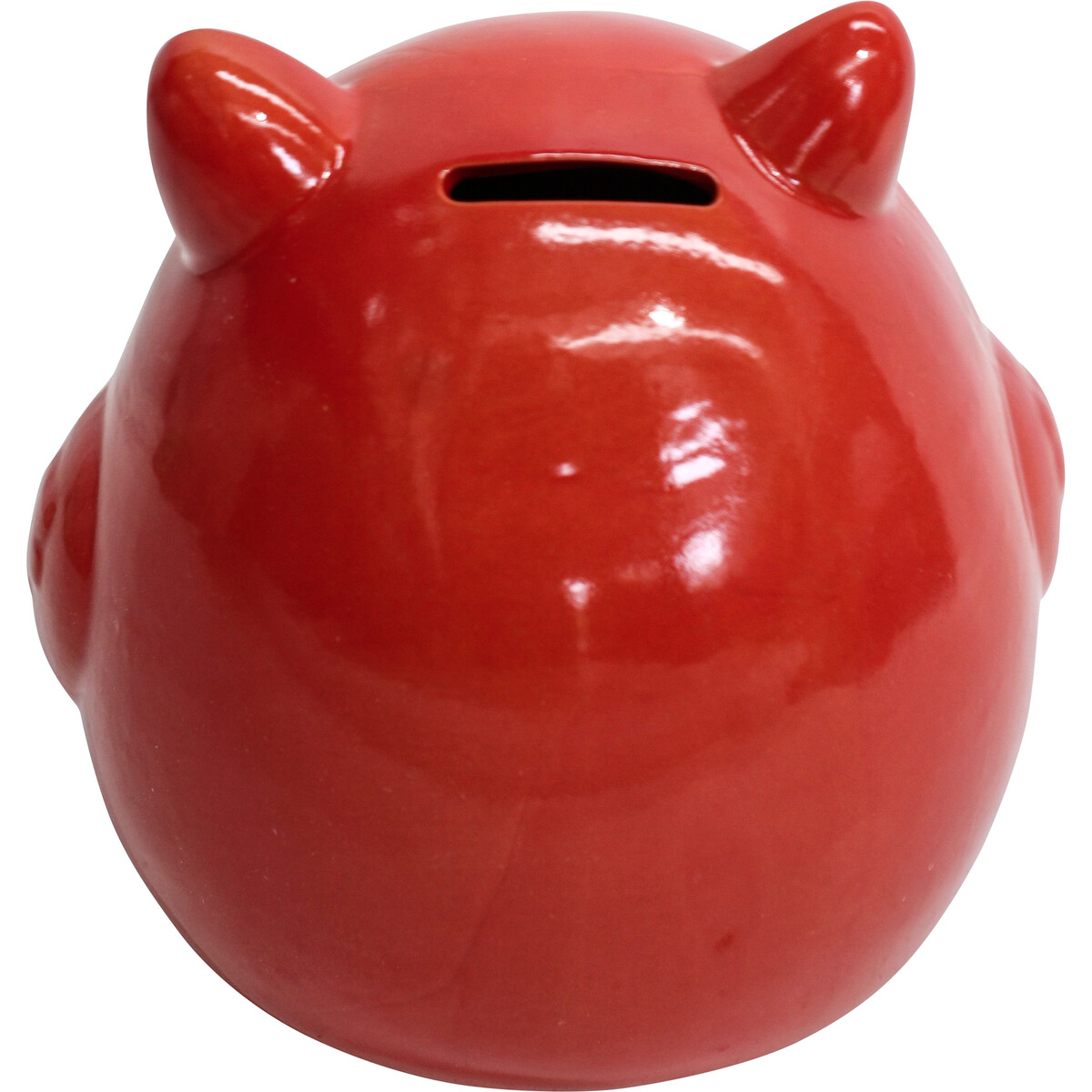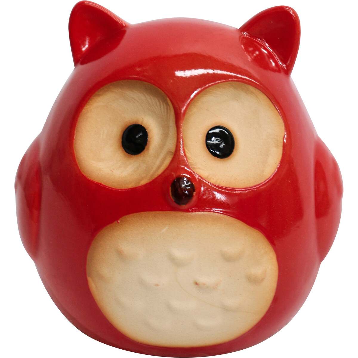 Did you know that apart from having exceptionally good night vision, owls are capable of living up to 25 years? That is a quarter of a century. Often considered since ancient times as wise creatures, it is for the sake of their wisdom that a group of owls is called a parliament – just like modern day governmental parliamentarians. It is this same smart creature that chicly inspired the shape and motif of this ceramic moneybox. It is predominantly painted in bright shade of red hue.