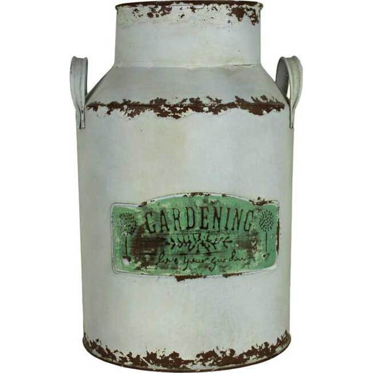 The rustic charm of this garden pail reminds one of those days of yore when fresh milk and bread arrived at the doorstep each morning carrying with it the whiff of the natural farm fresh feel. This pail is about 28 cm tall and has a white rusted body with paint peeling off in places .That is in fact its most beautiful feature. The tin label on it reads ééGardening' and it is an antique copper finish green. The antiquated look of this pail is what makes it most suitable for decorating the outdoors. The tall and classic shape of the urn like pitcher makes it also quite viable for placing creepers that can drop down its sides when placed on it. The pitcher has strong handles by its side that makes its shifting quite easy. The handles come with a broad grip .The peeling paint may make the pitcher look old but the metal used is strong and will see many years of use. The words at the base is rather telling of the love one feels for gardens - Love Your Garden éit reads and with props and gardening paraphernalia as pretty as these - one would éeasily!