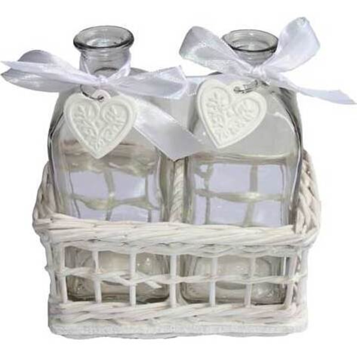 Introducing this Pair of Bottles in Baskets. It consists of two clear rectangle shaped open bottles that have a white bow tied around their necks and a white heart shaped tag attached. The best part is that they come in a white basket, so not only does it add to the fabulous presentation, but it makes it easier for you to transport without breaking them. The recipient will absolutely adore receiving a gift from you, but even more so if it's packaged in this gorgeous collection.