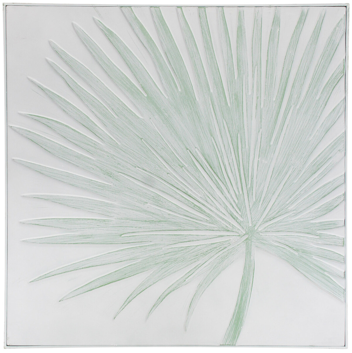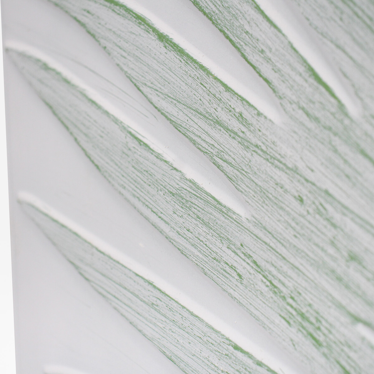 Crafted in a square shape, the Palm Leaf Wall Art is made in a large sized dimension which measures 81.5 centimetres in length, 3 centimetres in width and an equal 81.5 centimetres in height. On the metallic surface of this wall art is the ornate depiction of a fan shaped leaf which is luxuriously painted in alluring shade of green before being extensively painted in white with the stroke of the painting brush being quite visible on the artwork.