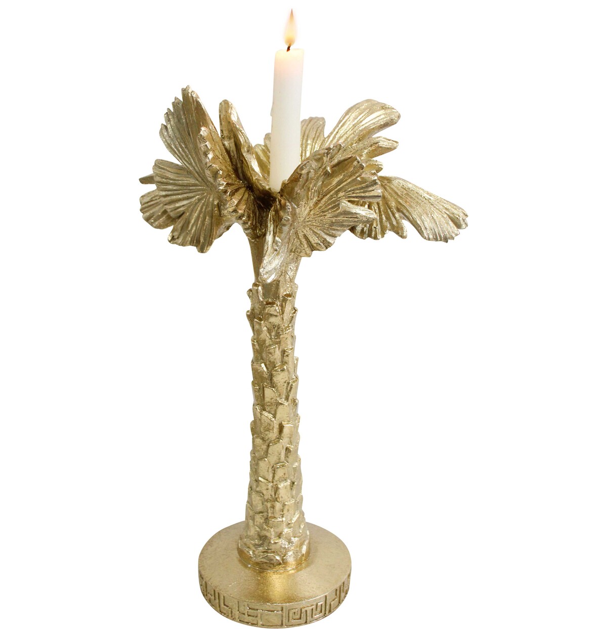 This large candle holder - measuring at 23x19.5x36.5cm - is cast in resin and metal for durability and lasting appeal. The base, which also features ornate detailing, keeps things steady and balances the palm design up top. These are great statement pieces for retail window displays. Or they can be featured as part of an eclectic collection of gold decoratives with complementary textures and finishes for maximum impact.