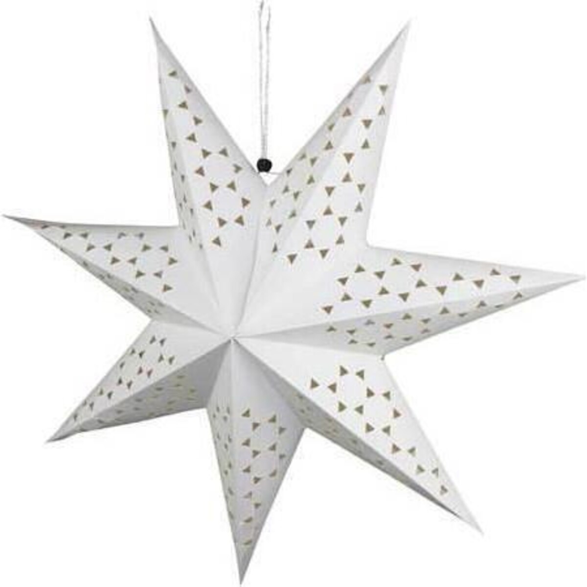 A fabulously designed decoration for Christmas that uses a geometric pattern all over the st to further its beauty and take it so much higher. Made of dense thick quality shimmery paper the shimmery white paper star is an easy way to bring the feeling of the season going in the outdoors as well as the outdoors. Place it in covered spaces so that it does not catch the dew. Easy to hang , this seven pointed star with its triangular design cut work design adds a look of cheerfulness that one needs to build into the décor not juts around Christmas time but also on Birthdays. Extend the party beyond and hang more such stars in a variety of spaces to create a fuller expression of joy. The star has a cord attached to it making its hanging rather simple and easy to execute.