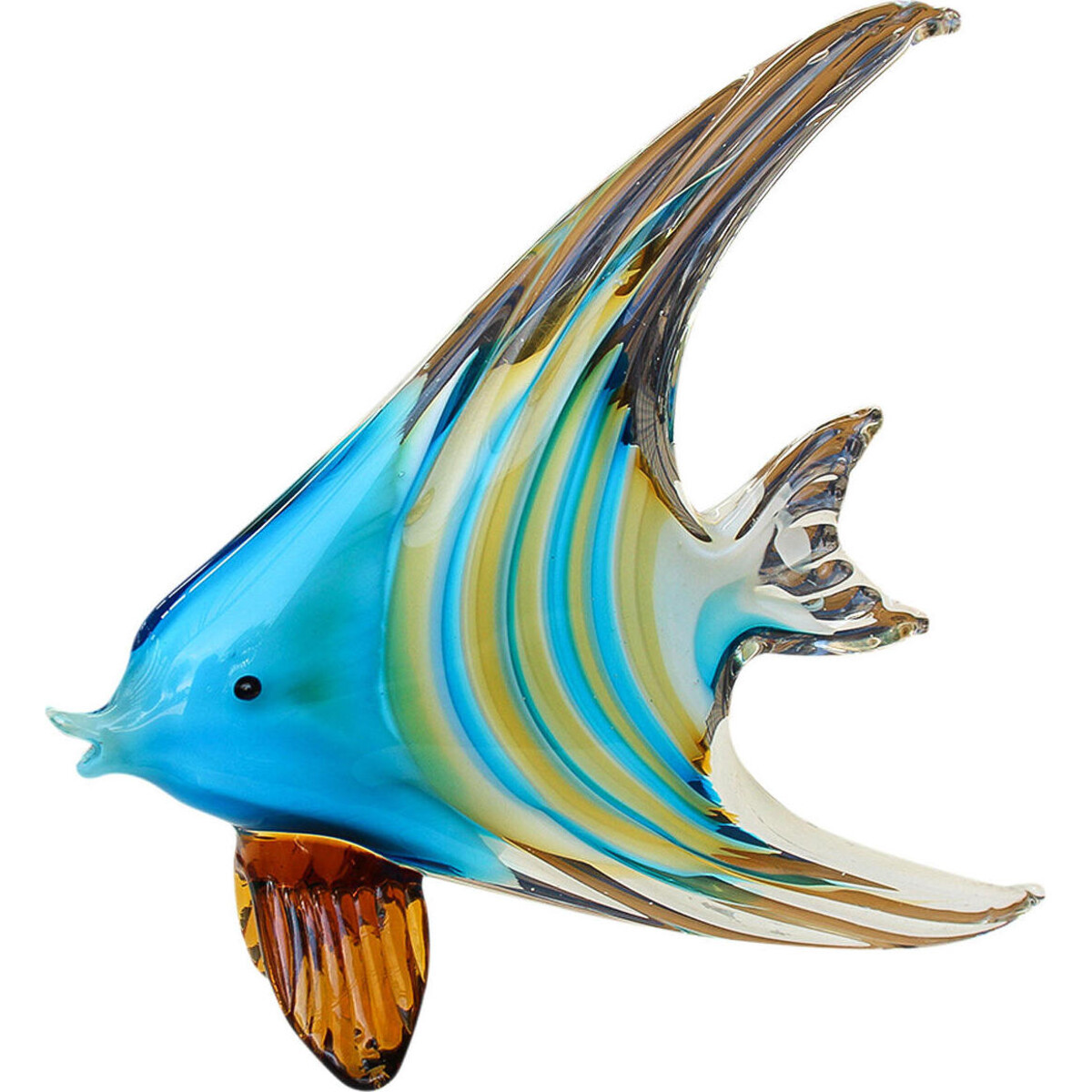 Perhaps the best medium of crafting that brings out the beauty of marine creatures -this glass made angle fish is perhaps a rival to the visual treat the real creature in the deep sea is. The expertise of the glass maker's craft is evident in its superb usage of colours and the smooth and superb finish the body has been given- the majestic raised fin, the delicate range of colours and hues infused into the body and the well balanced structure that will allow the 21.5 cm tall angel fish to balance on its fins underneath, which makes it such a delight to add to your marine themed spaces. Use it on your desk and shoo away the boredom of work or simply add it to the console or the coffee table where its beauty can be fully highlighted perhaps under a source of light. The angel fish has a major turquoise influence in colour but there is ample usage of tawny golden yellow to balance that out. The tail and the head too have been beautifully crafted with much attention to detail.