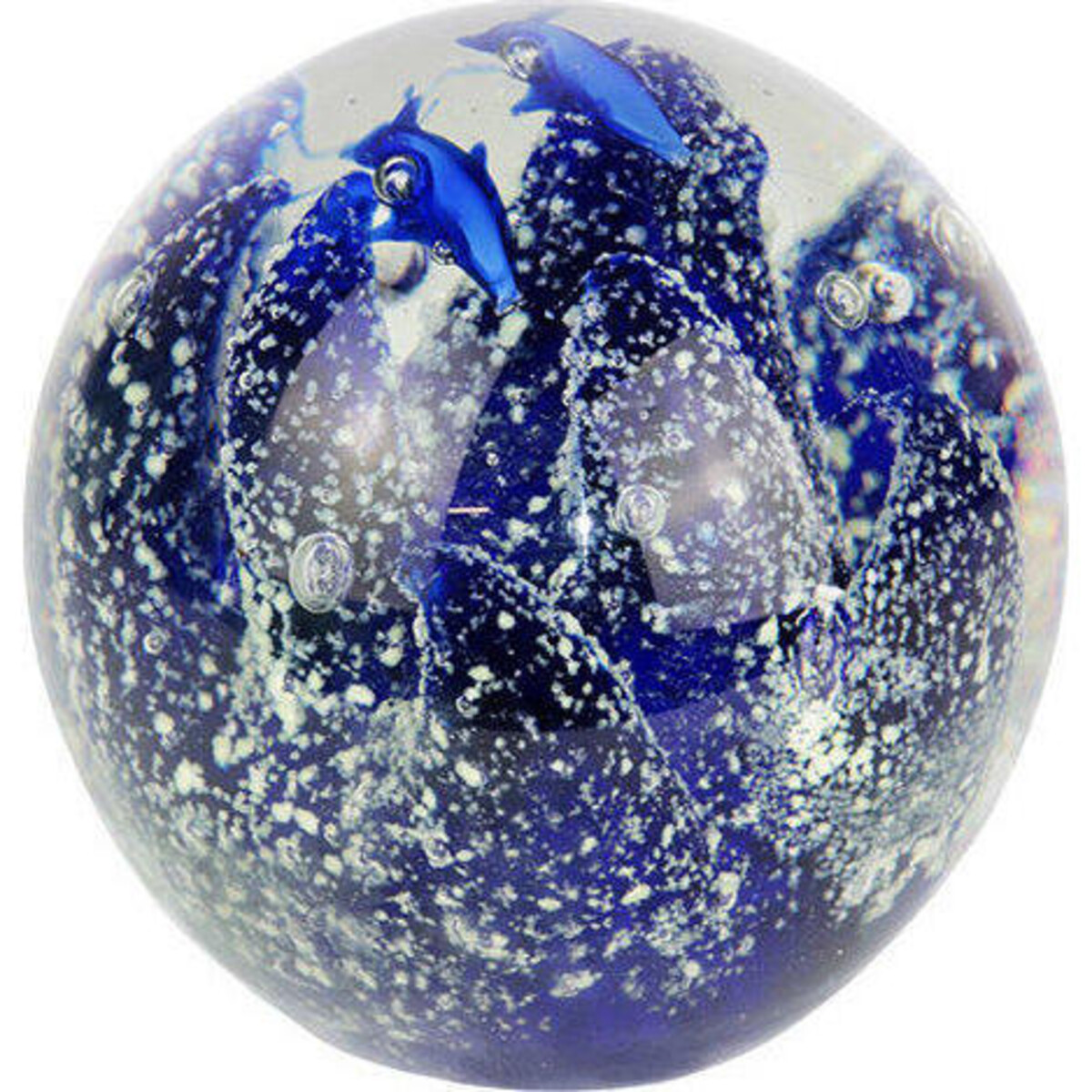 This aquatic themed paper weight on your desk will work as a wonderful accessory helping keep your flyaway sheets in order and under control. If you happen to find managing loose sheets a problem, a paper weight could be the answer to your problem. Here the spherical shaped solid glass paper weight has hundreds of bubbles rising as if from the ocean floor, from the base to the top as if indicating some movement and life. The tiny fish swimming within can be seen clearly as can the shape of the corals. A mesmerizing spectacle under water seems to have been captured perfectly by an expert glass maker who knows the magic of creating myriad colour effects. The paper weight has a height of 9 cm and a width of the same dimensions, thus making it well balanced while placed on a flat surface. Feels smooth, looks intensely interesting and makes for a wonderful spot of joy on your sometimes - dull desk!