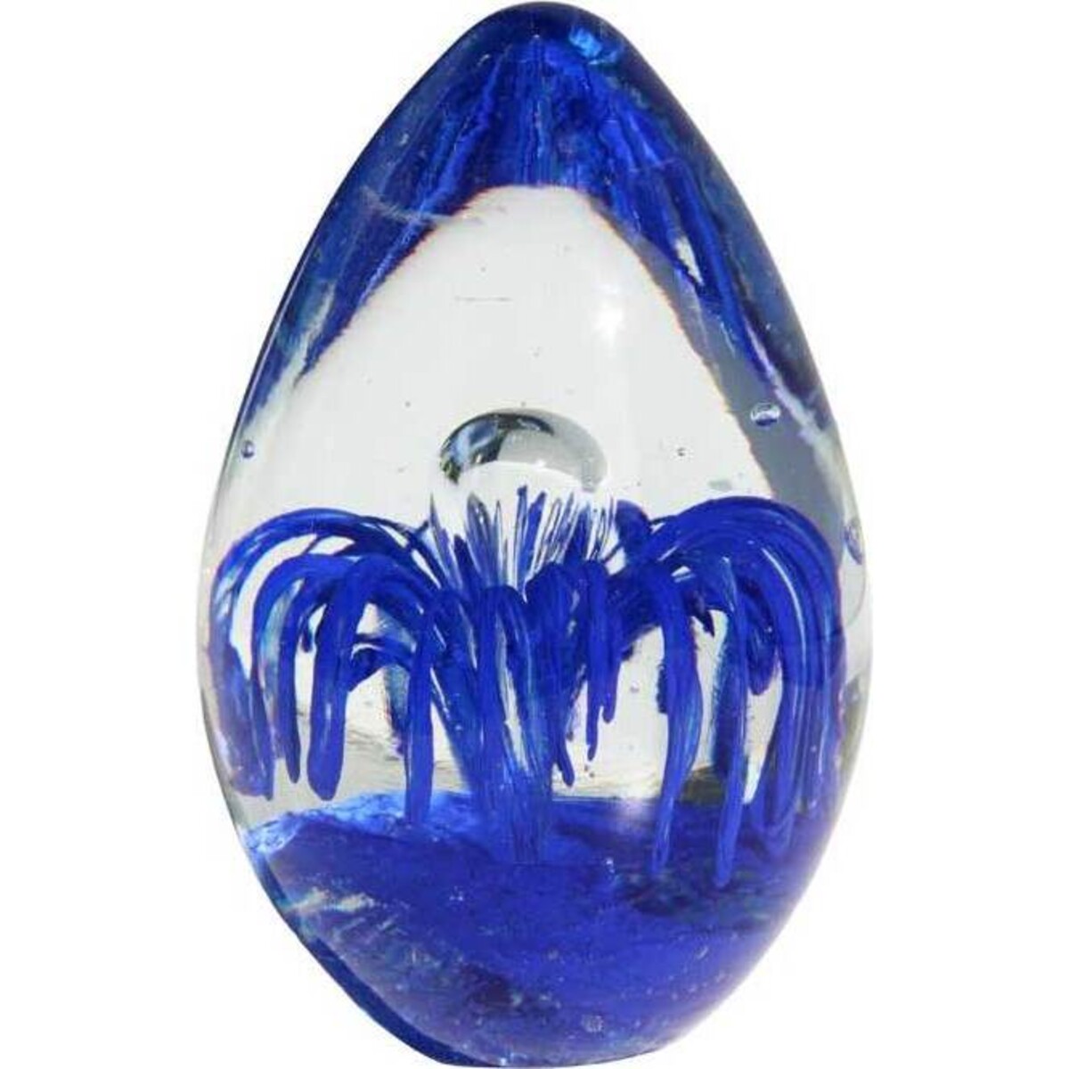 A simple shape with a rather dramatic play of colour is seen in this beautiful Blue Drop Paperweight which holds within it the caught in motion fall of a blue drop frozen, as in time, in glass. A smooth pressed glass surface in an oval shaped glass makes this the ideal paperweight for any desk, be it home or in the place of work. The attractive colour effect immediately takes the boredom away from the drab look of any work station. The look of art glass is evident in this piece that has a very simple design. Paperweights are things of great utility on any desk and generally feature some kind of uniqueness, yet this piece has something special going for it in terms of modern contemporary art and design. Its smooth surface texture gives it a fine smooth finish that anyone will feel like touching to comfort their edgy nerves. Will be loved by all those who like to own things that are simple yet subtly dramatic.