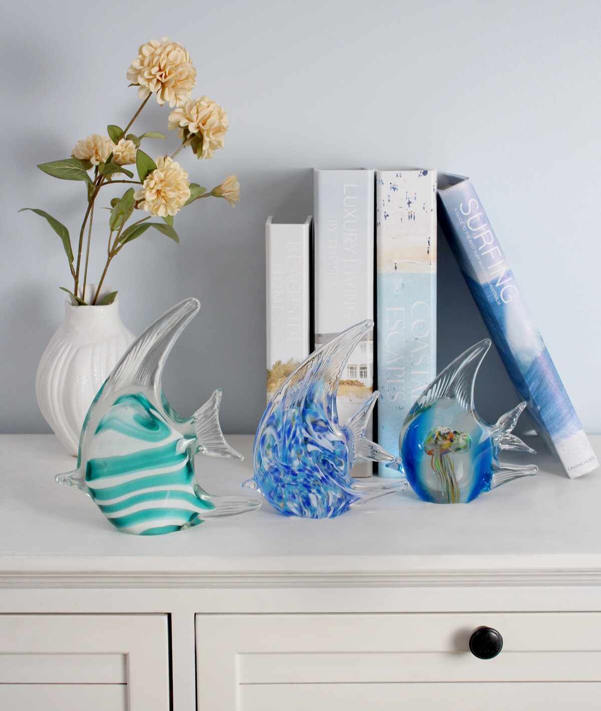 This one's playful but elegant at the same time - the Paperweight Fish with Jellyfish makes a real impact. We love how it feels both fresh and sort of like an heirloom item - it works wherever it's placed. It has that bold and super colourful jellyfish encased right inside the rounded body, which looks fantastic - very aquatic, right? There's mottling throughout and those tentacles are just so vivid. And because it's all done by hand, not a single piece is exactly the same as the next - each really does have its own unique personality.