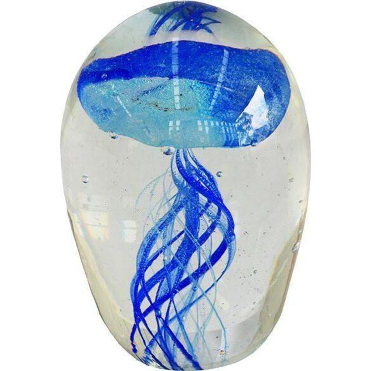 There is always a means to make your dull table filled with its motley crew of books, periodicals, and sheets and sheets of paper come alive with its own distinctive charm and that way is by adding some superbly crafted accents - one of which could be this jellyfish featured glass paper weight. Barely 7 cm in height, what it does despite its tiny little size is to make the jellyfish lo kike the most dramatic of creatures that seems to get a life its own caught in this glass bubble. Gorgeous in its detail, the disc and its luminiscent tentacles all clearly visible - it sure looks like it is about to pulsate to life. Inked in blue, the manner in which colours have been injected and given this lovely shape is the work of an expert glass blower whose craft is evident in this field. A lovely gift also for someone those whose love for things marine or coastal is known to you - or shoe long hours at the desk deserves a little gift once in a while. The 8 cm tall paper weight is oblong in shape and sits with complete balance on its flat bottom. The lovely jelly fish feature will surely be visible when kept under the light.