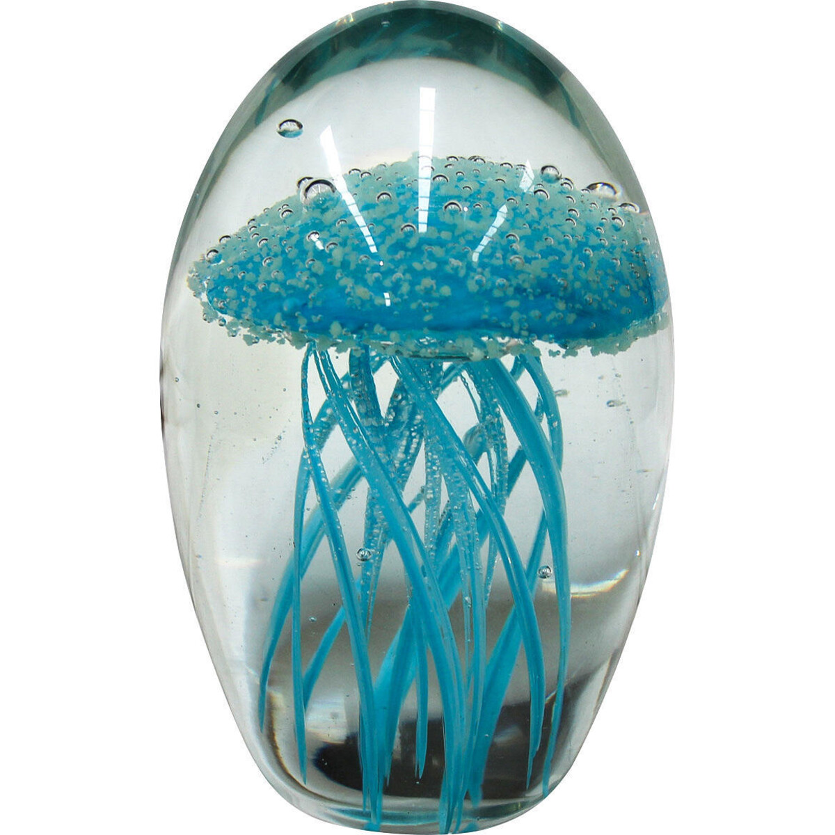 Crafted from hand blown glass for durability, it features the free-swimming marine creature trapped inside the glass casing. The detailed jellyfish structure and design along with the air bubbles look very realistic as though the paperweight is a large drop of water containing the fish! Use this as an accent piece to home decor projects or as a great bookend. It has a wonderfully smooth feel and offers a good weight for a child's study desk, office desk, side table or for the phone or coffee table.