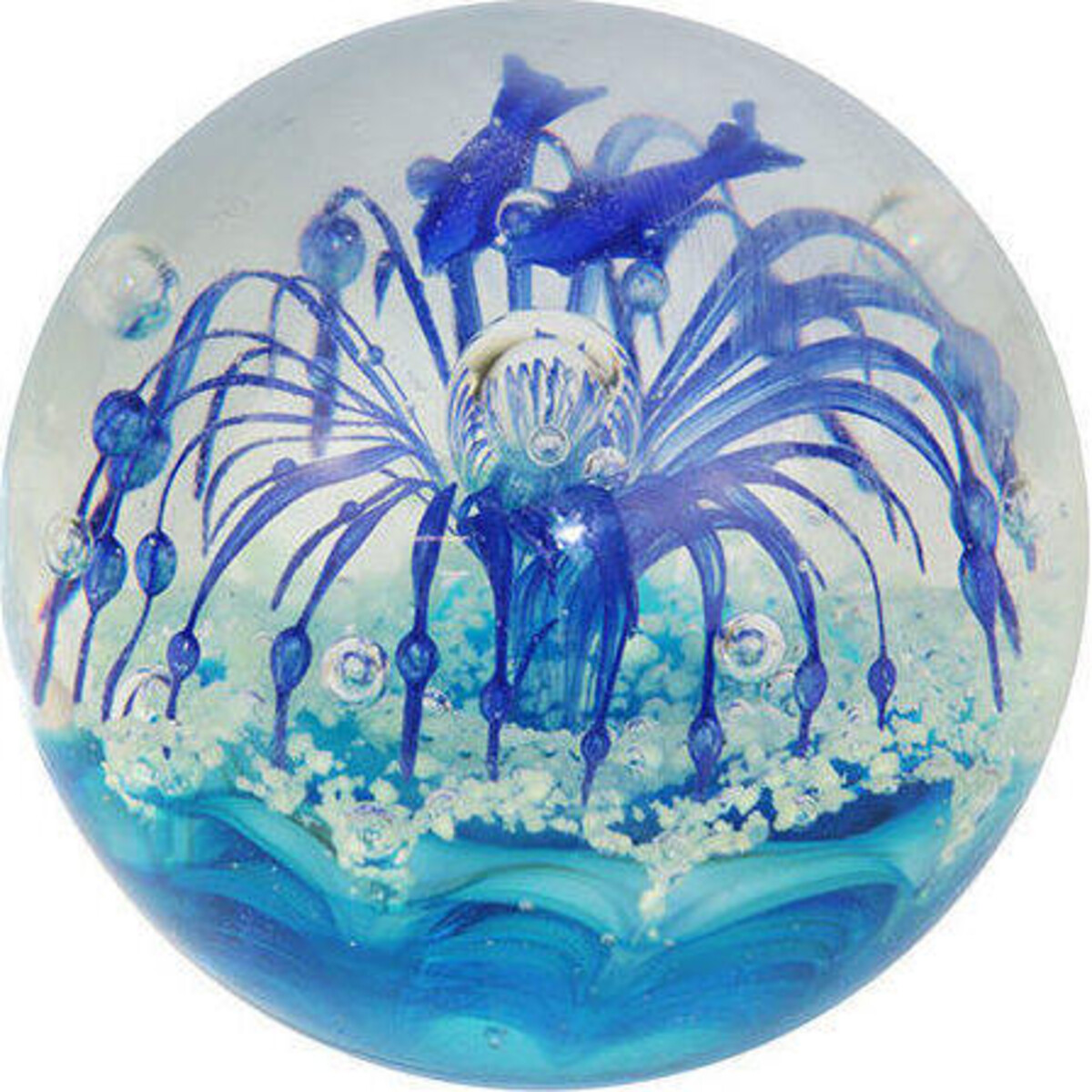 A paper weight is a great accessory for your study table if keeping sheets that you work on is a concern. While working on a larger spread sheet pin down the sides under its weight and you will find this spherical glass bauble doing its job fabulously well. The glass paper weight sits atop your desk displaying in its inner recess a splash of blue colour - bright effervescent in blue topped with fish that seem to be enthralled with the huge splash of water that spouts up from the base of the glass bauble. Created by an expert glass craftsman, this glass made paper weight combines the best in colours with forms captured with such perfection in its 9 - cm tall and 9 cm wide structure. Well designed and balanced so as to pin down a number of sheets, this paperweight will make your paper management quite easy on the work desk. Apart from that the lovely splash of colour it creates will help create more cheer on an otherwise stressful work hour.