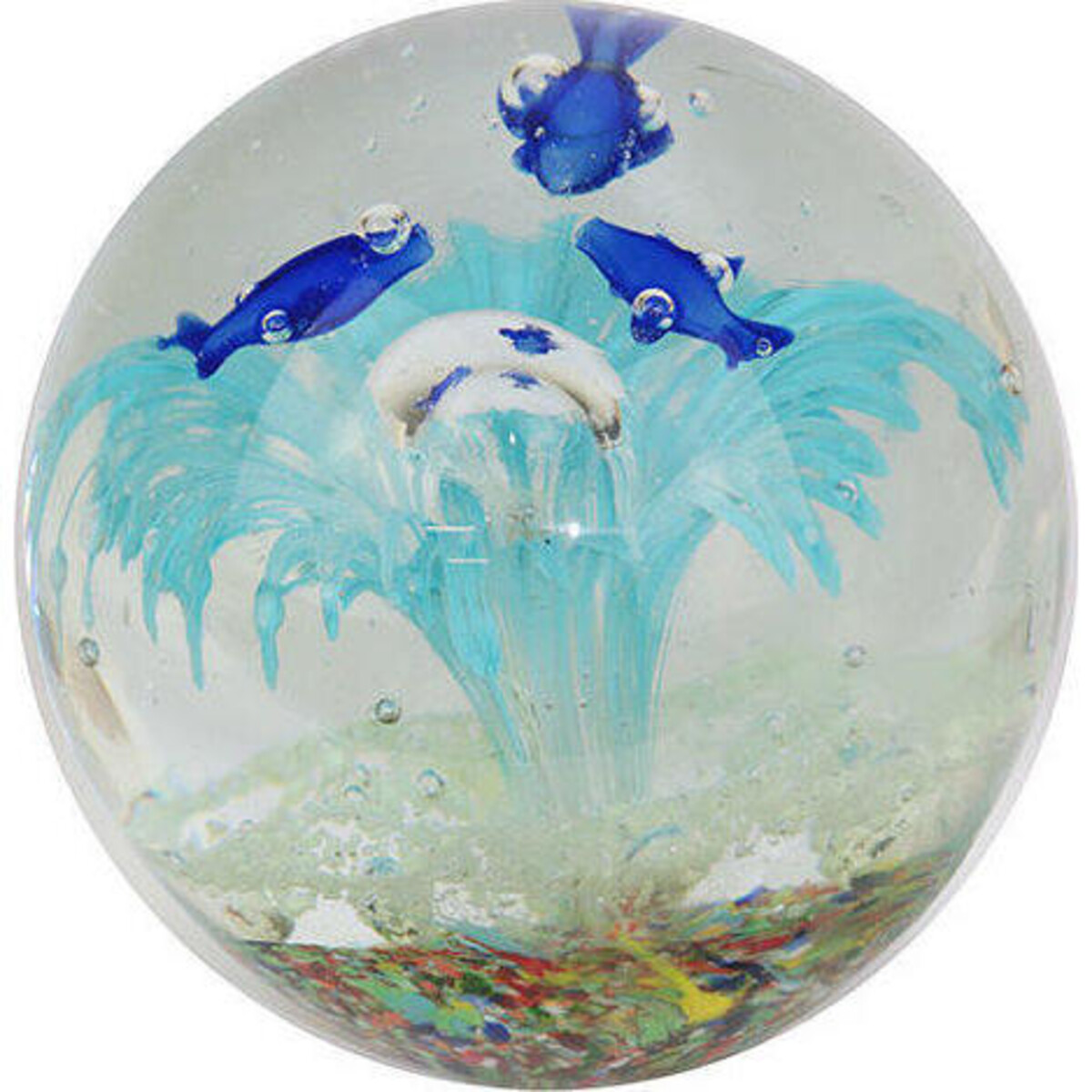 This paper weight would be just the thing you need to break the monotony that surrounds most of your desk work - smooth and oval shaped made with an intent to infuse colour and design with a discrete little form. It is made with fine quality glass that holds a spectacular design in the form of a splash of water as if frozen from under the sea. Little creatures perfectly formed in glass are caught in an animate moment. The myriad shades of blues, greens and of course several of the aquatic creatures makes it truly a wonderful little respite on your work desk. Heavy yet designed to sit smoothly on its base. The paper weight is all of 10 cm high and 10 cm in width and sits a little gingerly on its slightly flat base. The three - fish caught in the spout of water are clearly visible in blue and white. An accessory to help your keep your sheets of paper under control - it also adds a touch of colour and cheer to your desk.