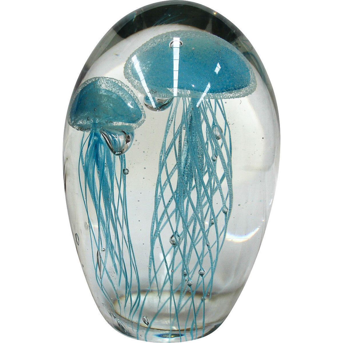 Useful on study tables, or even on bedside tables to keep little sleepers company, this Twin Jellyfish paperweight offers two cute little friends for keeping anywhere. Handcrafted from durable glass, the presence of air bubbles accentuates the nature of the traditional hand blown crafting process and shows two textured motifs of jellyfish in aqua blue.