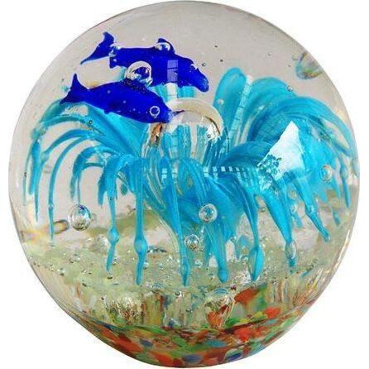 This gorgeously coloured ball shaped paper weight is the quintessential paper weight. Simple in its shape it is sure to keep your sheets and other cuttings well under control. The indigo coloured fish that swim as if around a blue coloured coral, playing hide and seek and searching for new ways to enjoy their independence. The ocean behind looks like it has been dipped in a colourful spray of rainbow shades. This effect makes the entire space within come alive with new interest artistically created through the technique followed when hand blown glassware is created. The rich spectacle of colours is what lends more form and essence to the glass bubble. The height of the glass globe is about 7 cm and its diameter too is 7 cm. It makes for an attractive little accent on the table and will for sure help make your desk look more charming. Sits well balanced on its base and does not roll over.