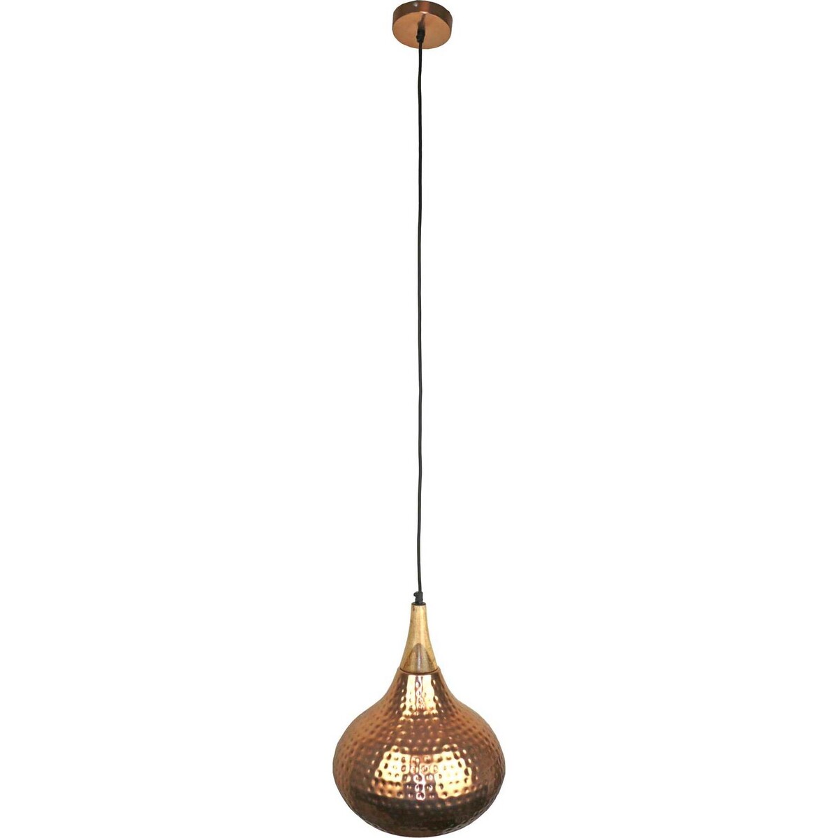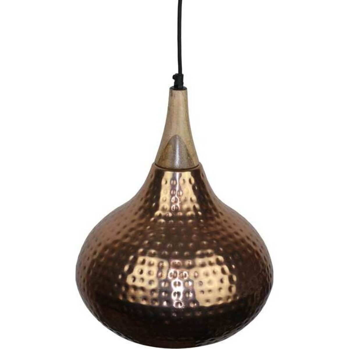 Pendant lamps are hung low as per the need of the interior and in the case of this gorgeously designed copper and wood combination lamp, the design that is on metal makes it all the more noteworthy. The little impressions created on the surface makes one wonder if the metal has been beaten to form the pattern. It gives a gorgeous textured finish to the metal. Eye catching and versatile in design, it would be as suited to homes as to offices and its handsome good looks will be hard to miss wherever it is placed. The options for usage are endless and the height at which you would want to hang it will make a difference in the manner in which the decor gets illuminated. A great way to enhance interiors and also draw attention to the classier side of the decor. This lamp may be combined with smaller shades or one larger one to further highlight its textured surface and unique shape. Its diameter is 22 cm while the metal body has a height of 31 cm and its total hanging length is 37 cm.