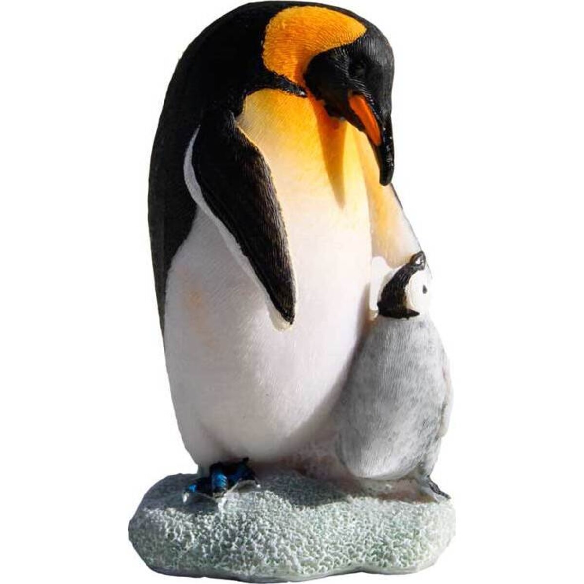 The King Penguin is recognized by his colouring. The large ring of orange feathers around the neck and across the upper chest makes him one of the most colourful large birds. Black wings, head, and tail feathers, and white front feathers complete his palette. • The baby stands below looking up sweetly while the parent bird looks down. • Baby bird is dressed in soft grey feathers with characteristic white head, black head stripe and black beak. • They stand on a bed of "frozen snow" that's coloured in light icy blue. • Resin construction makes this collectible hard wearing. Add this to your collectible sections in all departments throughout the store including gifts, home goods, toys, and children's departments.