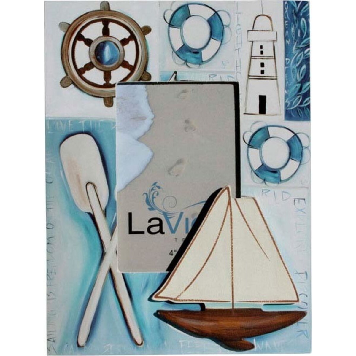 This Photo Frame Oars features an artistic drawing of beach elements including a lighthouse, a life buoy, a pair of paddle, and a ship's steer wheel. One interesting design detail is the boat with a white sail. The white sail on the boat artistically overlaps with the rectangular hole that will frame a photograph. The consistent use of pastel blue colours also reflects the artistic sentiments of the Beach Art Specialist that designed it. This photo frame that doubles as a d_cor truly exudes a fresh aura that is akin to the beach. As for the orientation, this photo frame strictly portrait. It is best used to frame photographs that are taken in portrait mode. It is probably most perfect for single shots.