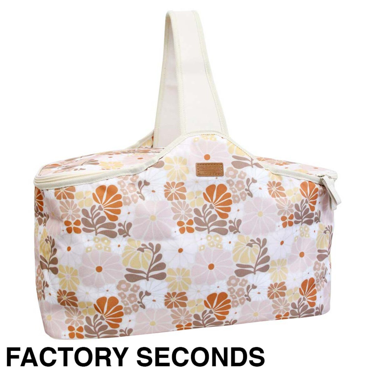 A picnic bag and a statement piece - this one is definitely eye-catching with its geometric floral pattern in retro shades of pastel peach, orange, yellow, taupe, and cream.