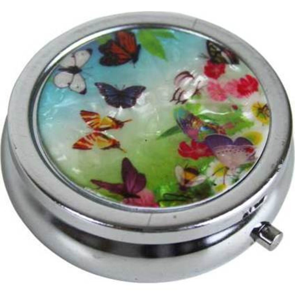 LaVida has created a series of collector - worthy pill boxes that are small is size but big on style. The Pill Box Butterfly is a shiny silver box with a decorative lid adorned in tiny butterflies, bees and flowers. The lid features a shimmery, capiz - shell like appearance for added depth and luster. A small push - button latch is included on the side. This pill box can be used in the conventional manner, but could also be used to hold any variety of tiny items from straight pins to small earrings. It also makes a tidy accent piece on a bedside table or vanity.