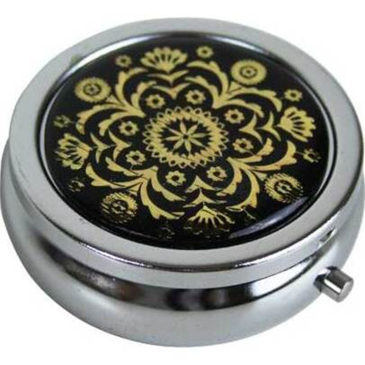 LaVida offers an elegant and practical way to keep up with an everyday ritual with its Pill Box Gold Motif. This box is one in a series of pill boxes from LaVida worthy of collector status. This particular box features a shiny silver body with adorned in a striking black and gold medallion design. The design is intricate with small flowers and leaves radiating from the center. In addition to holding pills, this stylish little box can be used to keep track of other tiny items or simply be used as a display piece to add a touch of class to any surface.