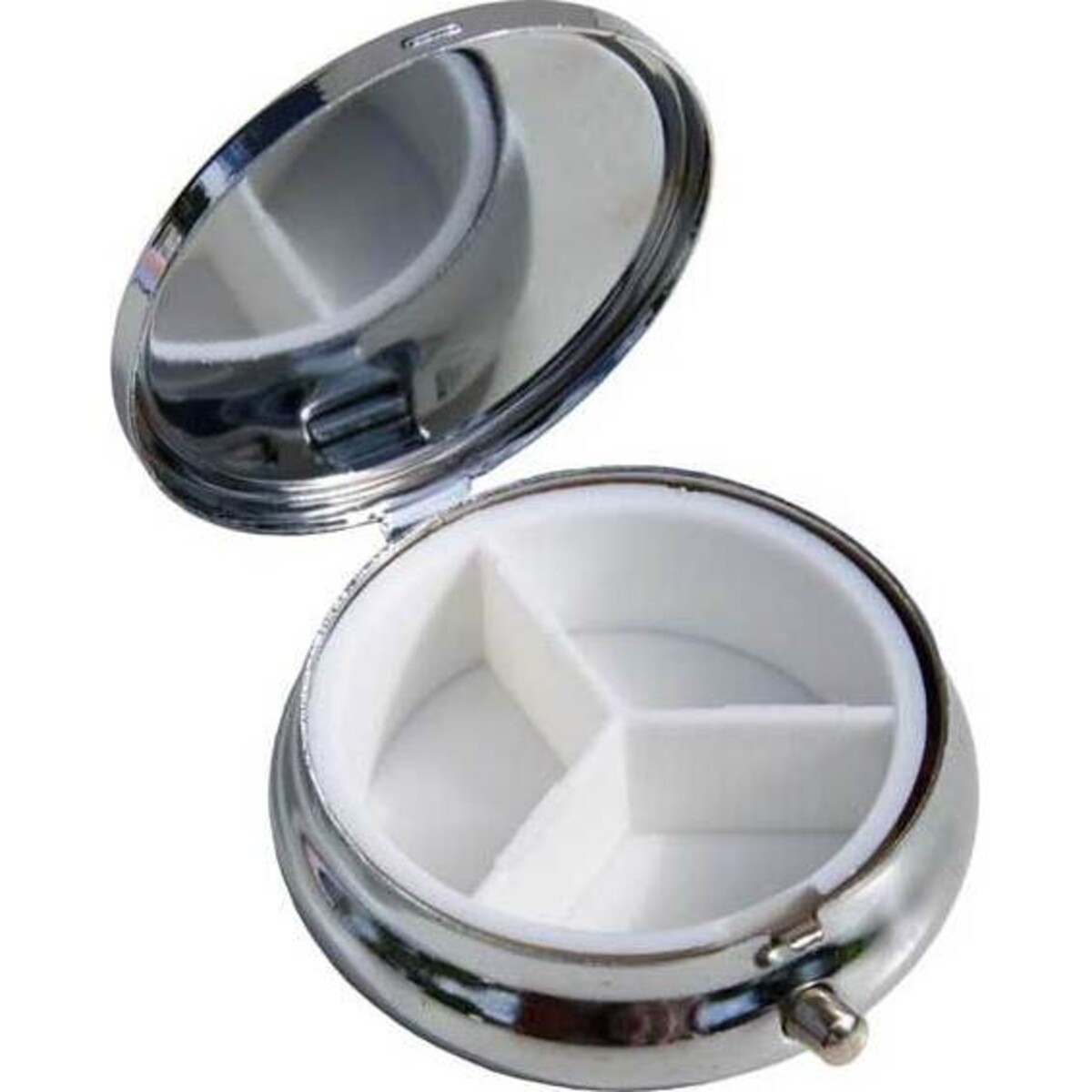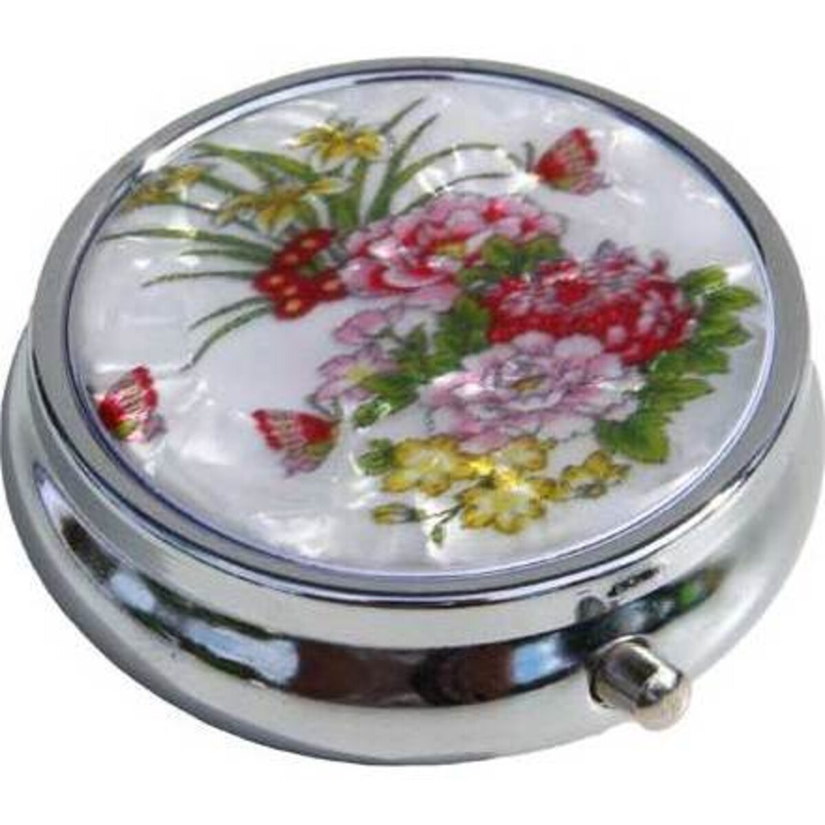 é Our Pink Roses Pill Box takes its inspiration from the beautiful inlay that graced the pillboxes of the 18th century. It's done in silver tone, with a small push button hinged lid and a mirrored interior. é The lid features a white lustrous background with a mother of pearl effect, and is embellished with a cluster of peonies, leaves, butterflies and other foliate forms. é A round squat shape tapers toward the lid, and the box fits neatly into a pocket or purse. This item will work well to punch up sales when placed near the register or with other small accessory and gift items such as collectible boxes, tins, jewelry, scarf rings, key rings, or purses.