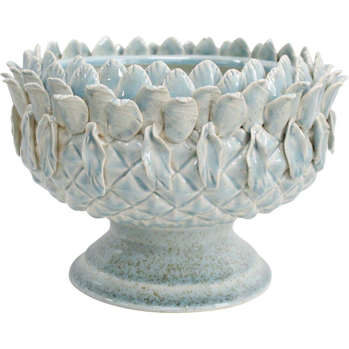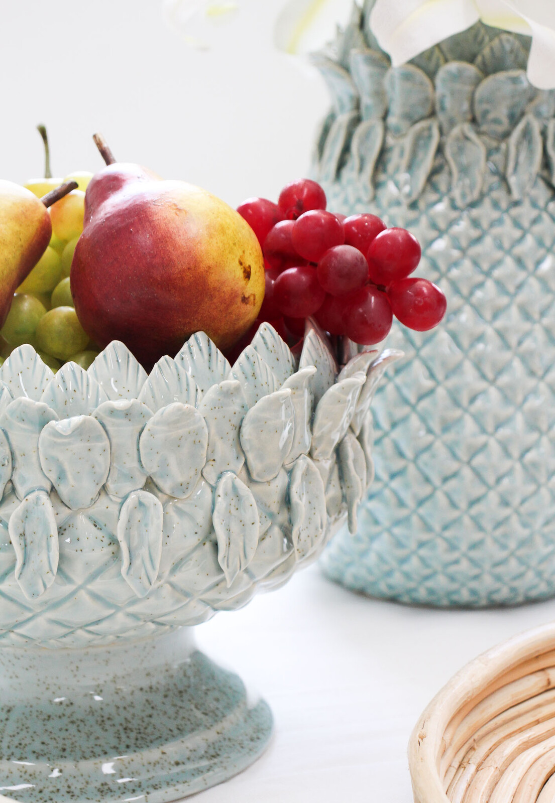 Discover the enchanting allure of the Pineapple Pedestal Bowl Lagoon, a splendid addition to any home or office decor collection. Exuding an air of tropical sophistication, this handcrafted ceramic bowl is a true masterpiece that stands distinctively at 25x25x16cm. Its serene lagoon colour palette, subtly sprinkled with a reactive glaze, promises a one-of-a-kind piece where no two are precisely alike, making it an exceptional conversation starter and a cherished gift.