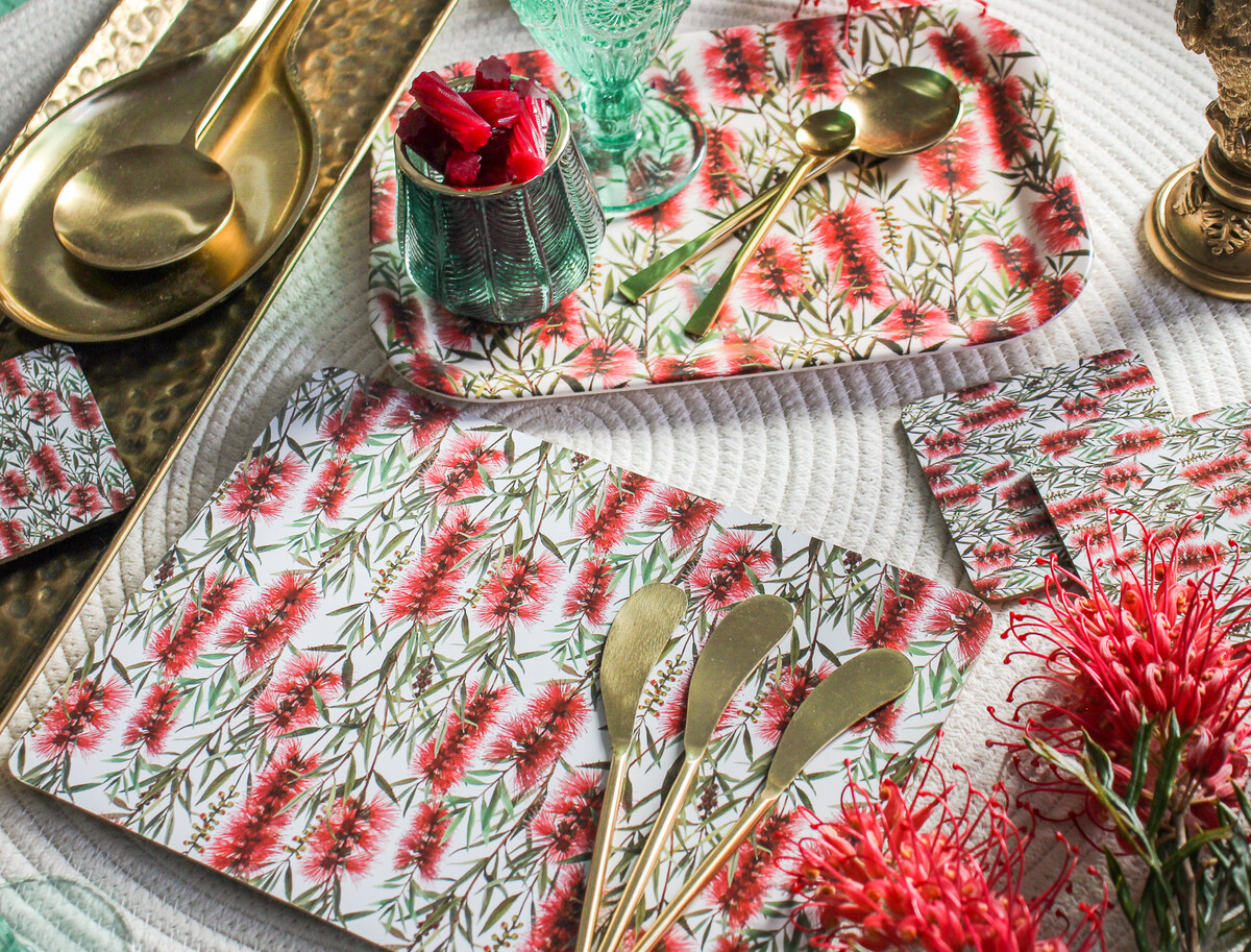 Giving your tabletop setting a whole new look gets easier when you have the right kind of accessories. Placemats play an important role in your everyday table settings, which in fact, makes them a regular part of your everyday table usage. Lavida brings you sturdy cork and MDF made mats that are easy to maintain, lightweight and slip free table mats, designed in a manner which helps them bring in in a fresh natural Vibe to the table top. The bottle brush flowers in the print look vibrant and filled with cheer. The white and red of the main colours , get the advantage of vibrant Green from the foliage. The set has four mats each with a length of 30 cm and a width of 21.5 cm. The mats are 4 cm thick which in fact indicates its sturdy structure. Will combine fabulously with table linen in all kinds of natural colours.