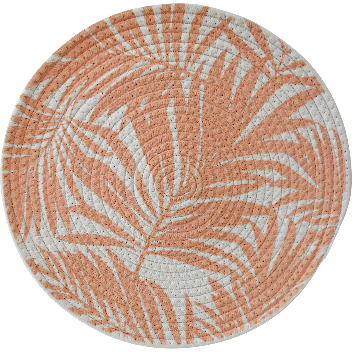 Measuring 38 centimetres in length, 38 centimetres in width, and being 0.5 centimetres thick, this Placemat Leaf Peach is not only ornamental, but also practically functional as a table protecting placemat. This placemat is uniquely appealing because it is made through the use of cotton material that is woven in a spherical form. Apart from this shapely form, it is further made charming through the ornamentation of plants. Hence, it is not only made from plant material, but also designed using plant motif while sporting a pretty peach and white palette.