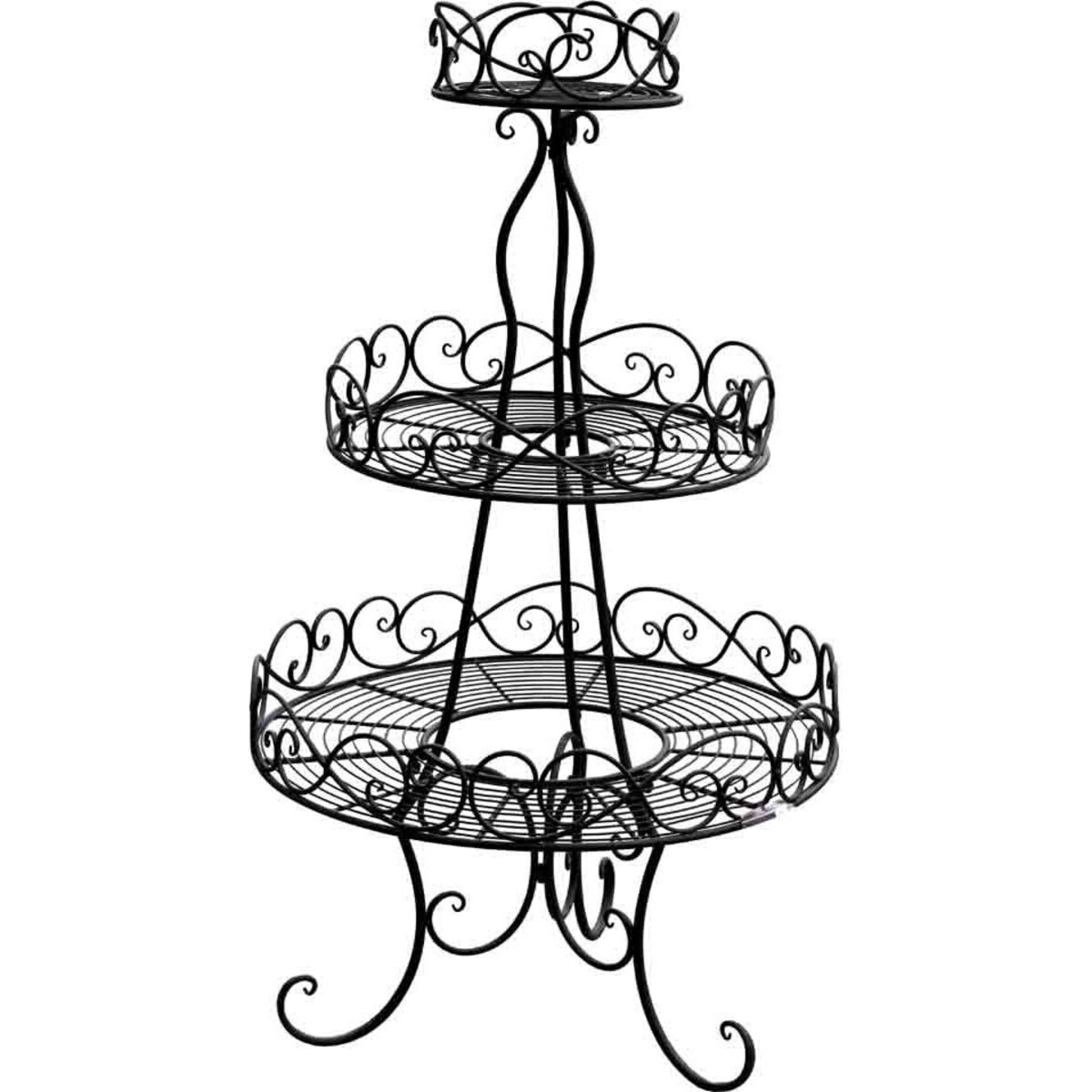 The Plant Holder - Valmont Dark is an elegant metal work that features Victorian style patterns. It is designed to hold multiple plant pots and can be used for both outdoor and indoor settings.