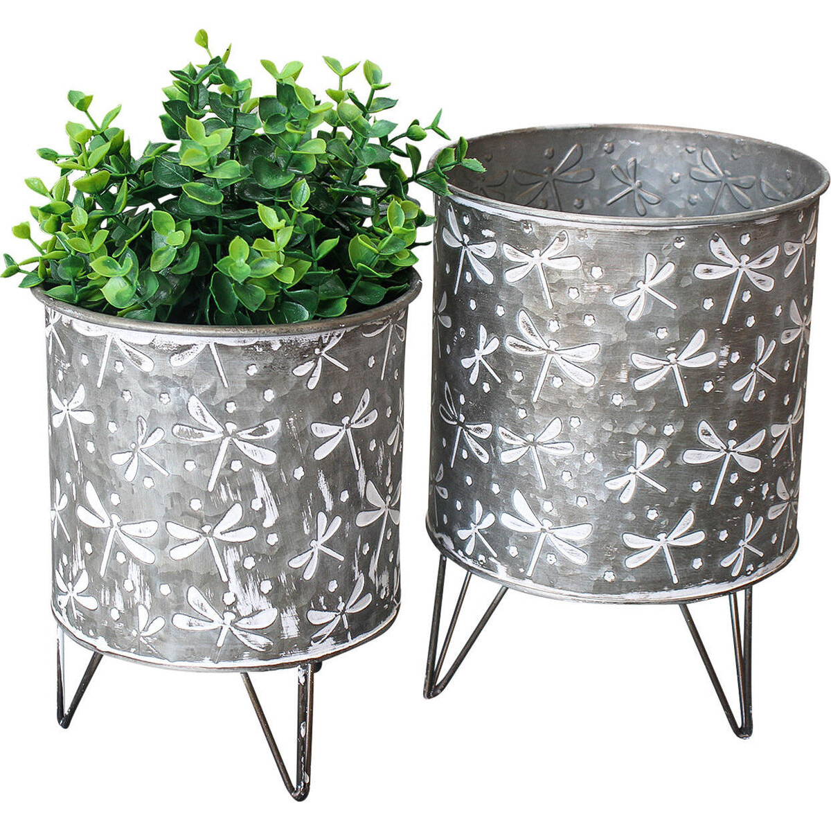 The contemporary grey finish with white dragonfly creates a flexible look that will go with many different types of decor, particularly well in minimalist, countryside, and nature-inspired spaces for easy styling. You can even fit in potted plants brought from the store and the height of the stand set allows for plants to nicely spill over the sides of each planter. These are handcrafted from iron metal sheets and the slight variations in each product add to their charm. Buy them with other matching planters in this range!