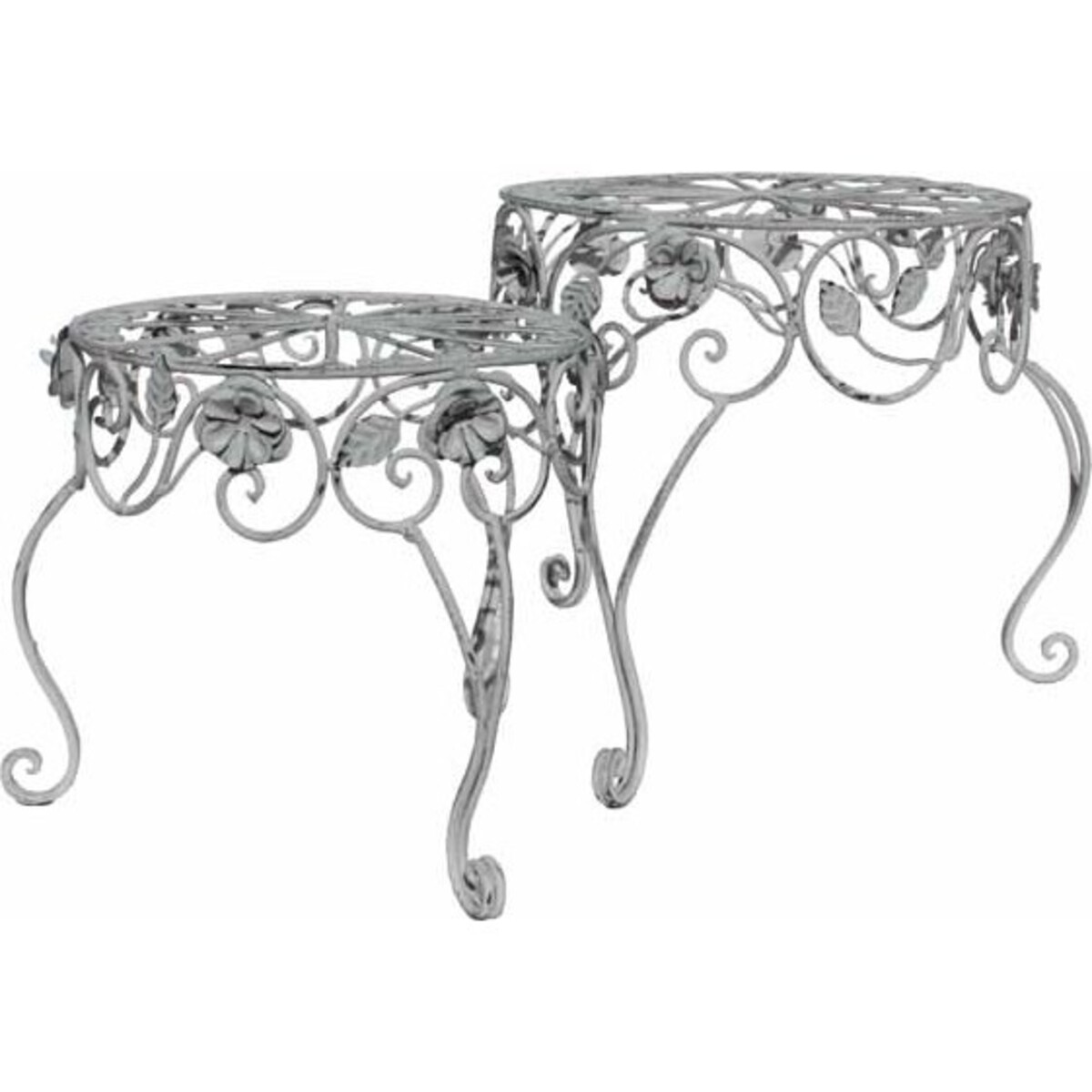 The Plant Stools - Hoja is a pair of tripod stands designed to hold flower pots in place. It is made of metal and features beautiful and elegant vine patterns. It also features sculpted flowers and leaves to add to the design.