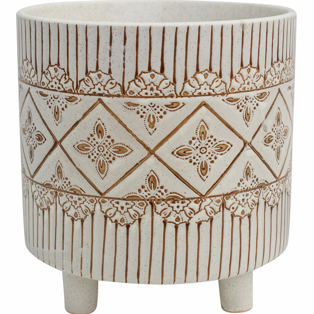 The magnificent glazing and etched in design which decorates the exterior of this planter is inspired by the designs often rendered by ancient Aztec. The elaborate ornamentation consists of three sections. The first and third sections are decorated in the same pattern featuring vertical lines and floral images at the base. The elaborate middle design features interlinked kite shapes which have floral patterns located at the middle of each kite. The planter itself is made in a round, large dimension using premium quality ceramic material. There are as many as 4 of this planter in every carton that you order today.