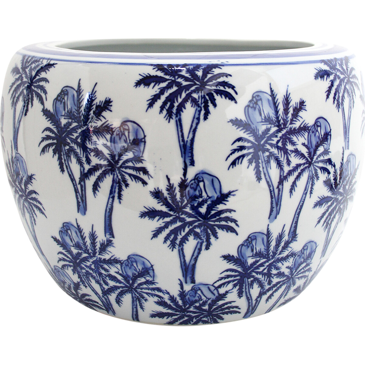 Unlike the medium sized Planter Bahamas version, this large sized version was deliberately made so in order to increase the functional range of this planter. It sports a dimension measuring 25 centimetres in width, 25 centimetres in length and 17 centimetres tall. This pot shaped porcelain planter has its smooth exterior glazed in charming images of tall palm tree portraits using a deep, bright shade of the colour blue. Some of the palm trees are depicted as standing together in groups of two, while the rest are depicted as standing alone.