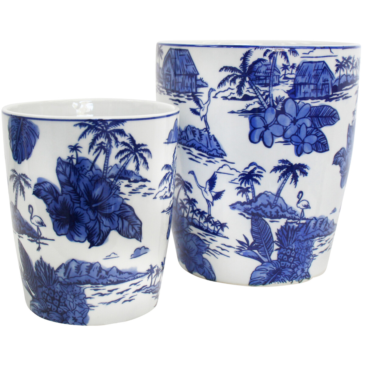 Made from porcelain that has been fired to perfection. The set has two planters in a blue and white combination. One is larger than the other, thus enabling you to mix and match your plants. You could simply place the plastic or clay pot inside and that will be the beginning of a very fine display. The plant itself has an elegant and sophisticated appeal which makes it a candidate for placing at of tables and counters. The larger of the two is 20 cm and height while the smaller one is 15 cm in height. Shaped almost like a flower vase, the base is round and slightly narrow and the shape widens towards the top which is attached in blue. The print is vibrant- displaying thatched huts, palm trees and foliage.