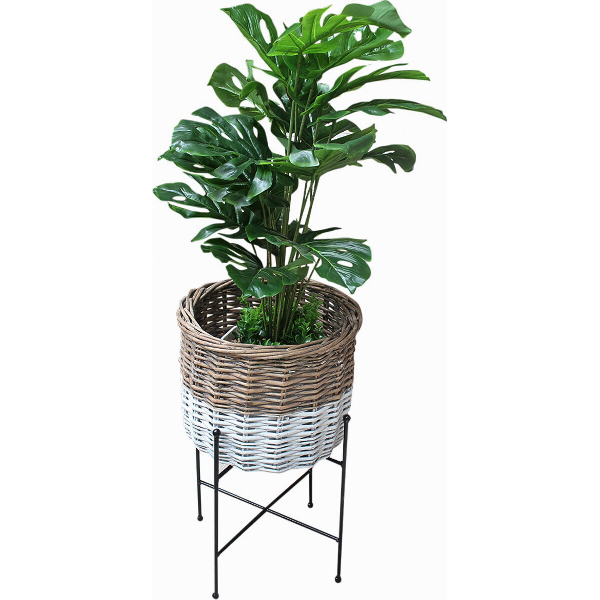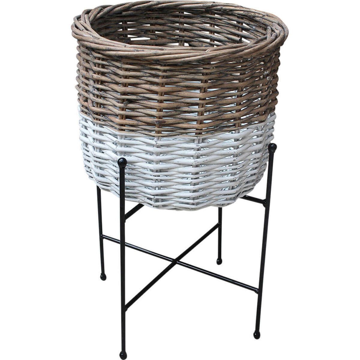 The wrought iron stand is perfectly proportioned so as to host the baskets planter most useful for hosting plants that need less water and even better for plants that can easily be removed and replaced with another variety the basket s handwoven from willow and thus is quite damp proof. The iron made stand adds to its neat and classic finish and stand robust and tall at 53 cm while the basket it holds is all of 32 cm in dimeter the potted plant could simply be placed within the basket without fear of disbalancing as the legs of the stand have bene made wide and being tri pod in structure it is well balanced as well. This planter will look as great in your interiors as in the outdoor, the combination of dual toned wicker with the white painted iron stand looks colonial and classy. Set the in corner of rooms or the patio and help your plants find the right kind of focus with this kind of help.