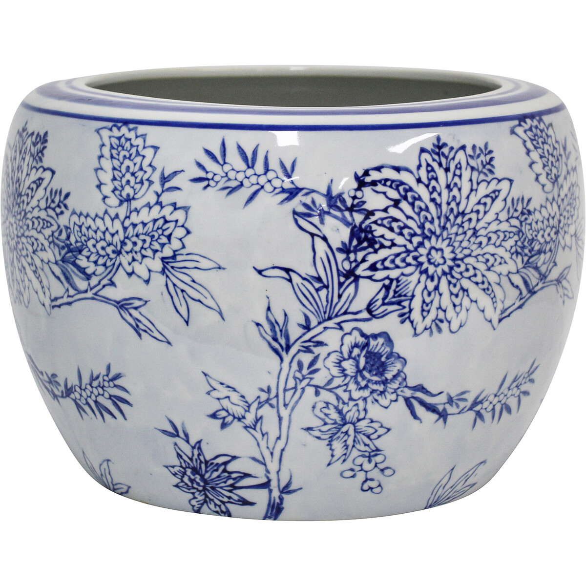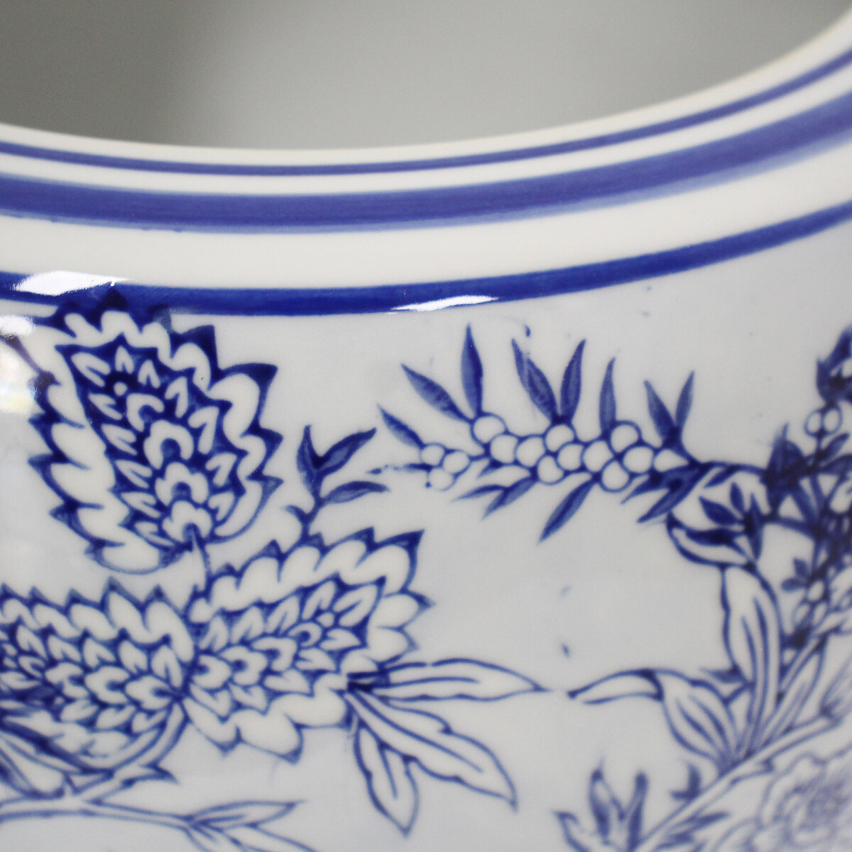 Given its ornately patterned floral glazing, the Planter Boho Tapestry Lrg would provide the perfect decorative backdrop to every choice of plants which customers and/or users may decide to use this planter to display. It would be perfect especially for displaying artificial floral plants while providing a colourful backdrop. Another standout feature is its round looking shapeliness and the smooth, glossy appeal. On its immaculate white exterior is the blue hand painted image of flowers using navy shade of blue.