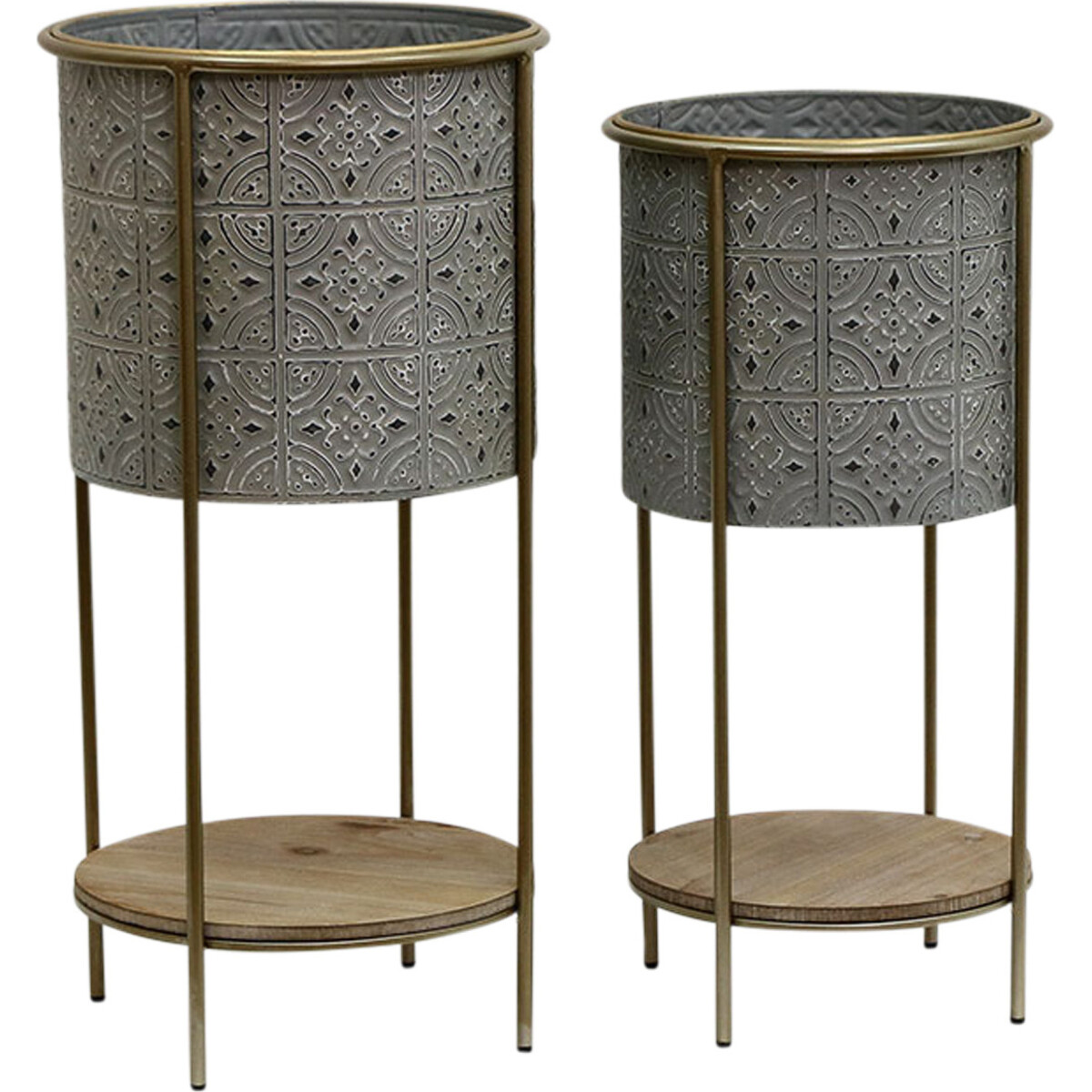 Handmade by professional artisans, it is no wonder that this Planter Caramel Timber Base S/2 has such an impressive visual outlook. It is made of the combination of two different materials; metal and timber. The actual planter is an ornately patterned metallic planter which is hand painted in matte white while it is supported and held high by four thin gold-coloured metallic stands . Close to the base of these stands is a flat all-natural timber on which can be placed several things such as another planter, gardening tools, or whatever else pleases your customers.
