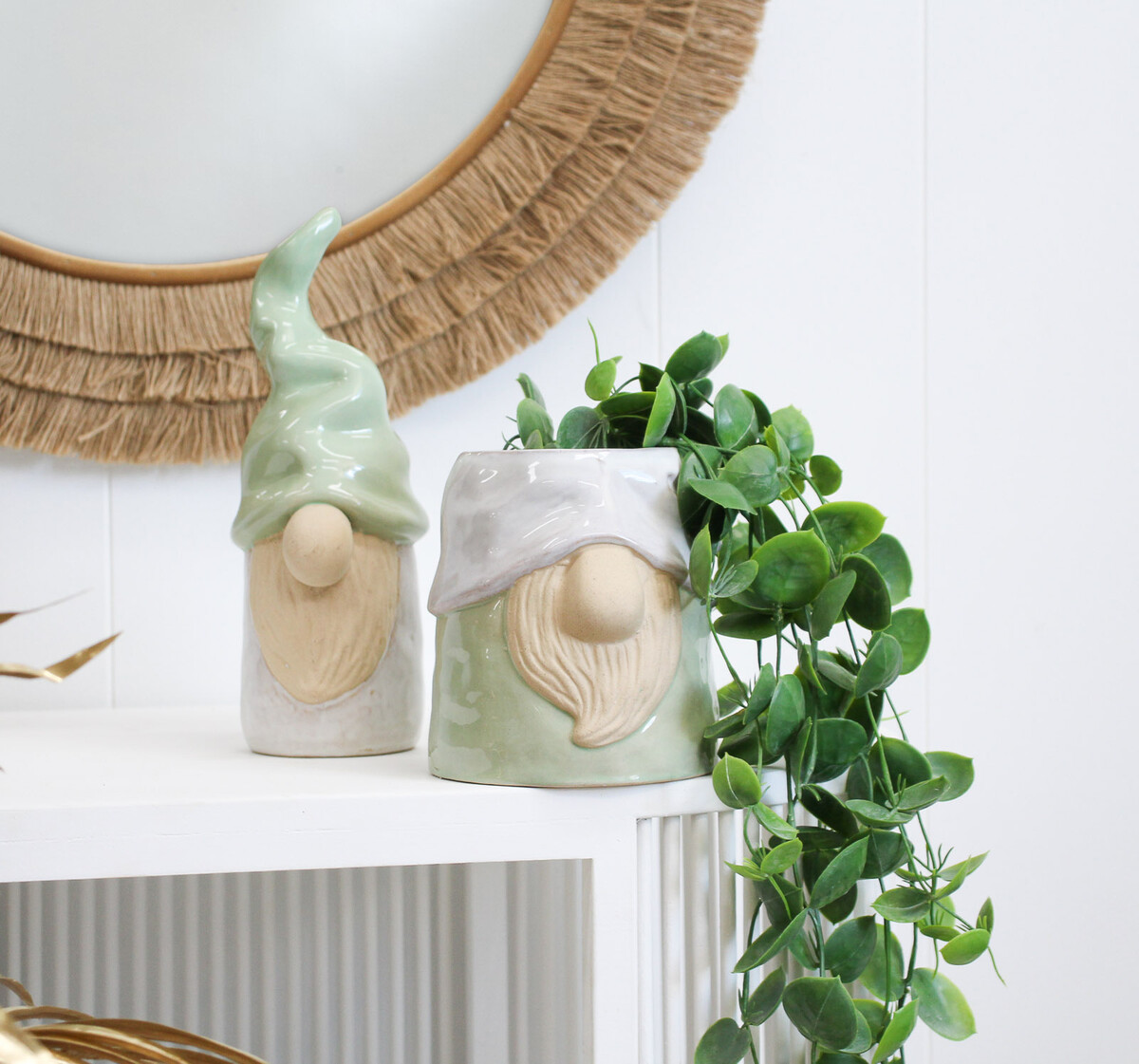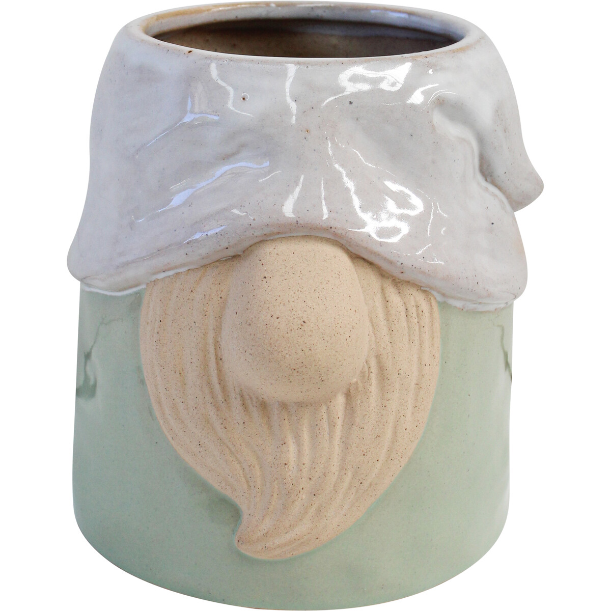 Cleverly moulded in a large but compact size, it is made in a vertically inclined dimension which measures 14.5 centimetres in its length, 13 centimetres in its width and 14 centimetres in its height. On one side of the planter is the distinctive beards and bulbous nose of a gnome with the background palette being a cool sage green hue. Round the rim of the planter is the use of cool, glossy white hue while the interior is a dark shade. It would be perfect for use in displaying various kinds of artificial plants including flowers.