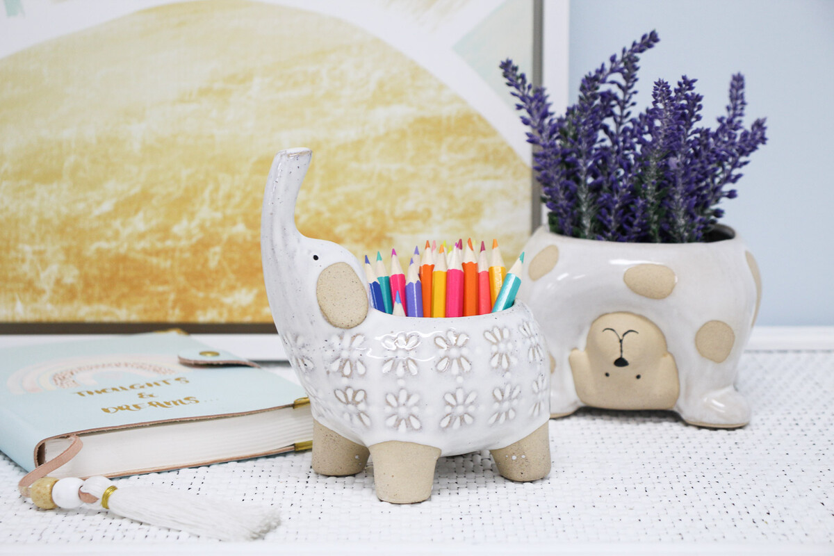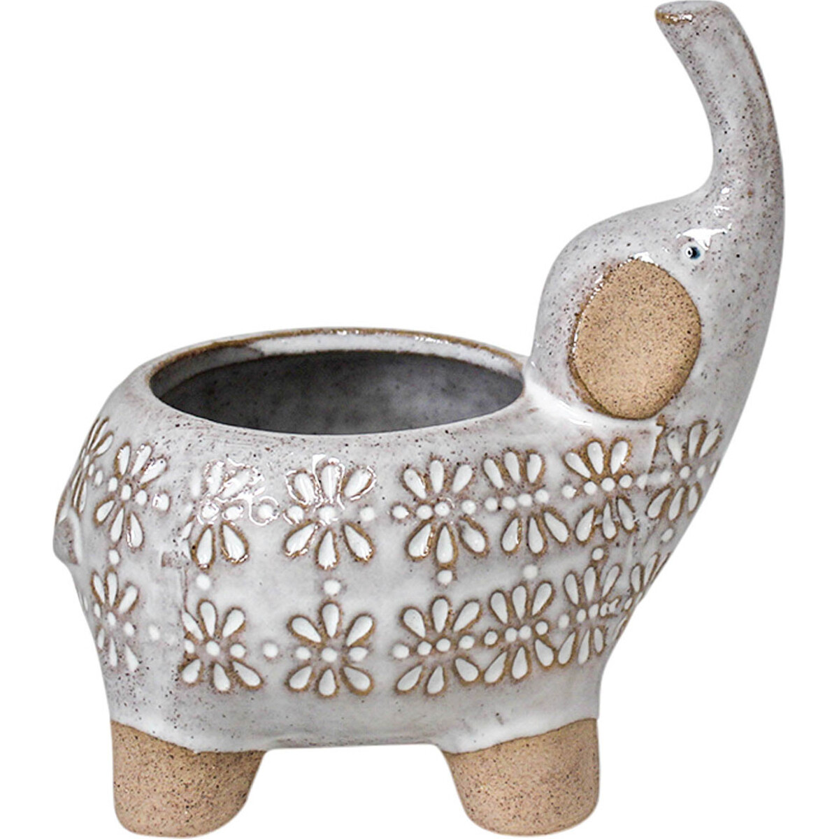 Infused with the motif of an elephant which features the figurine and shape of an elephant, this Planter Ellie Elephant has its big, round-looking torso cut open at the top/back. This open space ensures that plants can be grown in the hollow space which it contains. Proceeding from this part us the elephant's head which is remarkably presented with the usual big, flappy ears possessed by elephants and marked by two dotted eyes; one on either side of the head. The young elephant, named Ellie, raises its trunk upward in excitement while standing on four sturdy brown painted legs.
