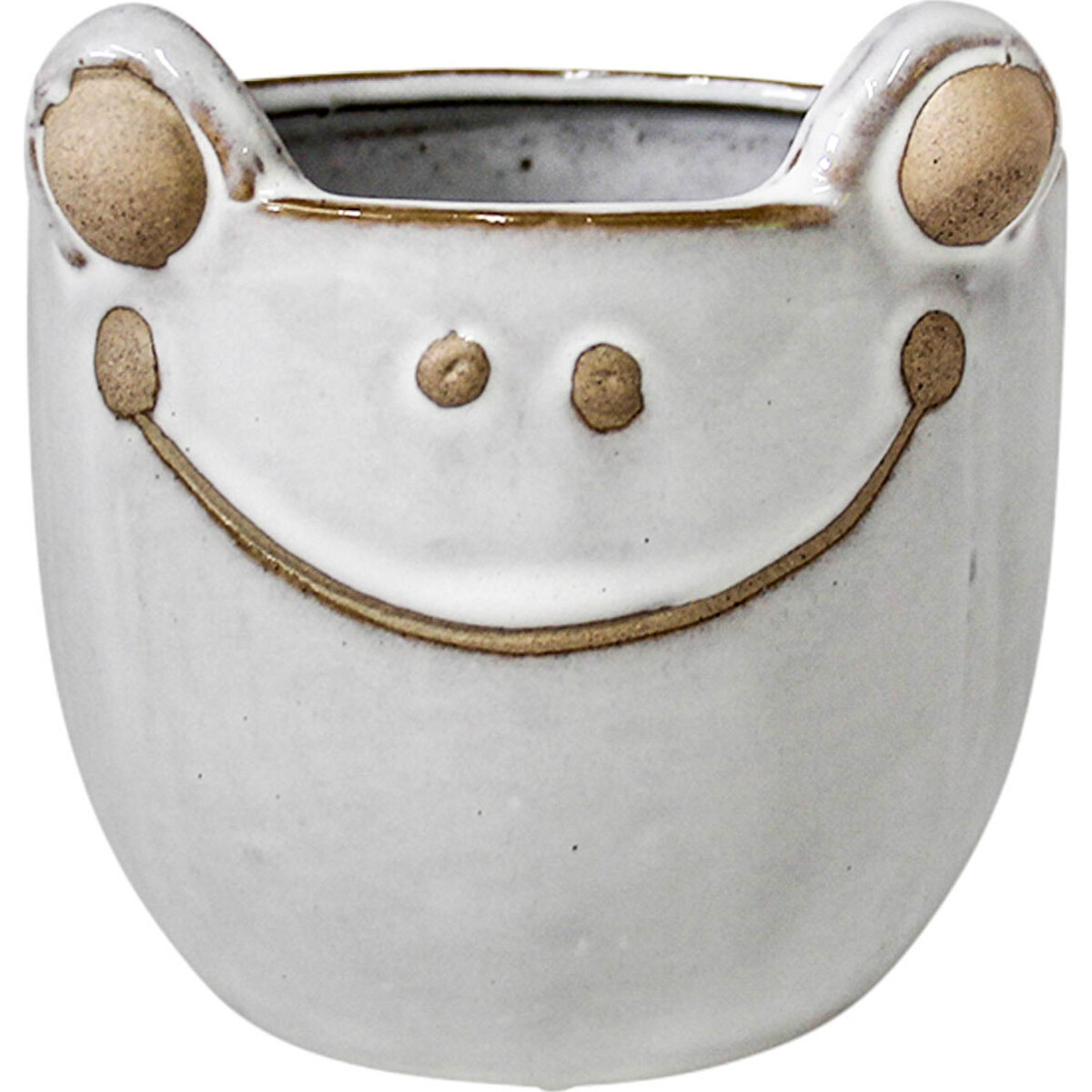 This planter is adorned with a cute smiling frog face hinted with a trickle of gold is sure to spread its positivity into one's plants and leave one's garden filled with positive smiling flowers all day long. With Planter freckle frog, one's plant is bound to sprout and bring out new flowers. These flowers can be used in one's living spaces to produce fresh fragrance. The portable size planter won't give owners worries of limited space due to its unique cuteness. Its white tint leaves a hint of new beginnings and neutrality. It has a handy handle that ensures proper grip wherever the planter is to be relocated. Hand-painted with skilled workmanship to give a finesse finish.