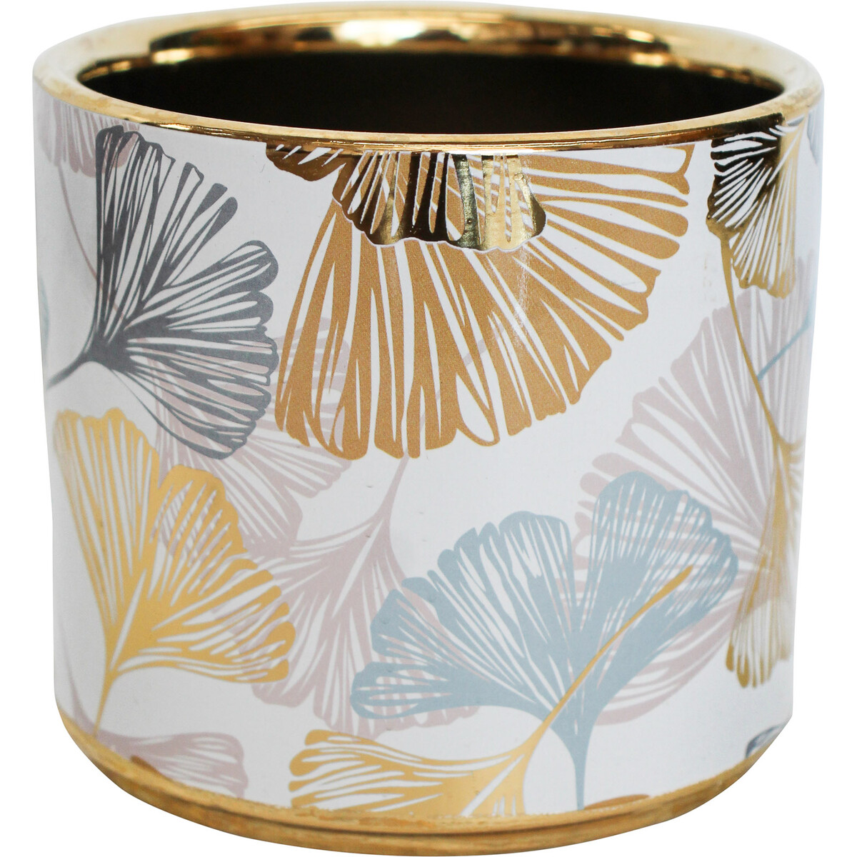 The right choice of planters can be a critical aspect of creating a green space. Usher in the beauty of nature by placing plants in your interiors and help you achieve that is some of the finest of planters in a collection on offer from lavida. The outer body of The plant has been a don't with a print of ginkgo leaves in beige and gold that looks absolutely scintillating against the white backdrop and it's high sheen. The upper and lower rims of the planter has been lined in Gold which defines the shape and the look further. You could use it for placing a medium size tabletops and counters and make a quarter display by combining similar design planters for a bold Splash of green, the height of the plant was just about 10.5 cm while its diameter is 11.5 cm- making at most suitable for small to medium sized plants with shorter stems that are suited for tabletop placements.
