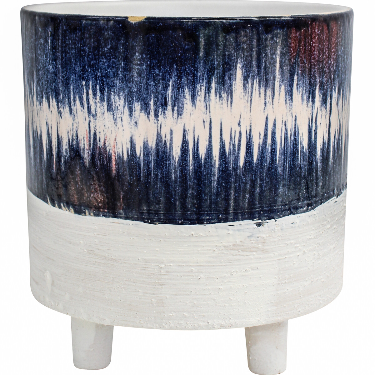 The Planter Indigo Wash Large is an example of skilfulness in pottery making. It features a design that is an assortment of colourful appeal and two distinctively textured patterns. The base of the planter is made in a white, coarse textured pattern while the upper section is a colourful white and indigo smooth textured pattern.