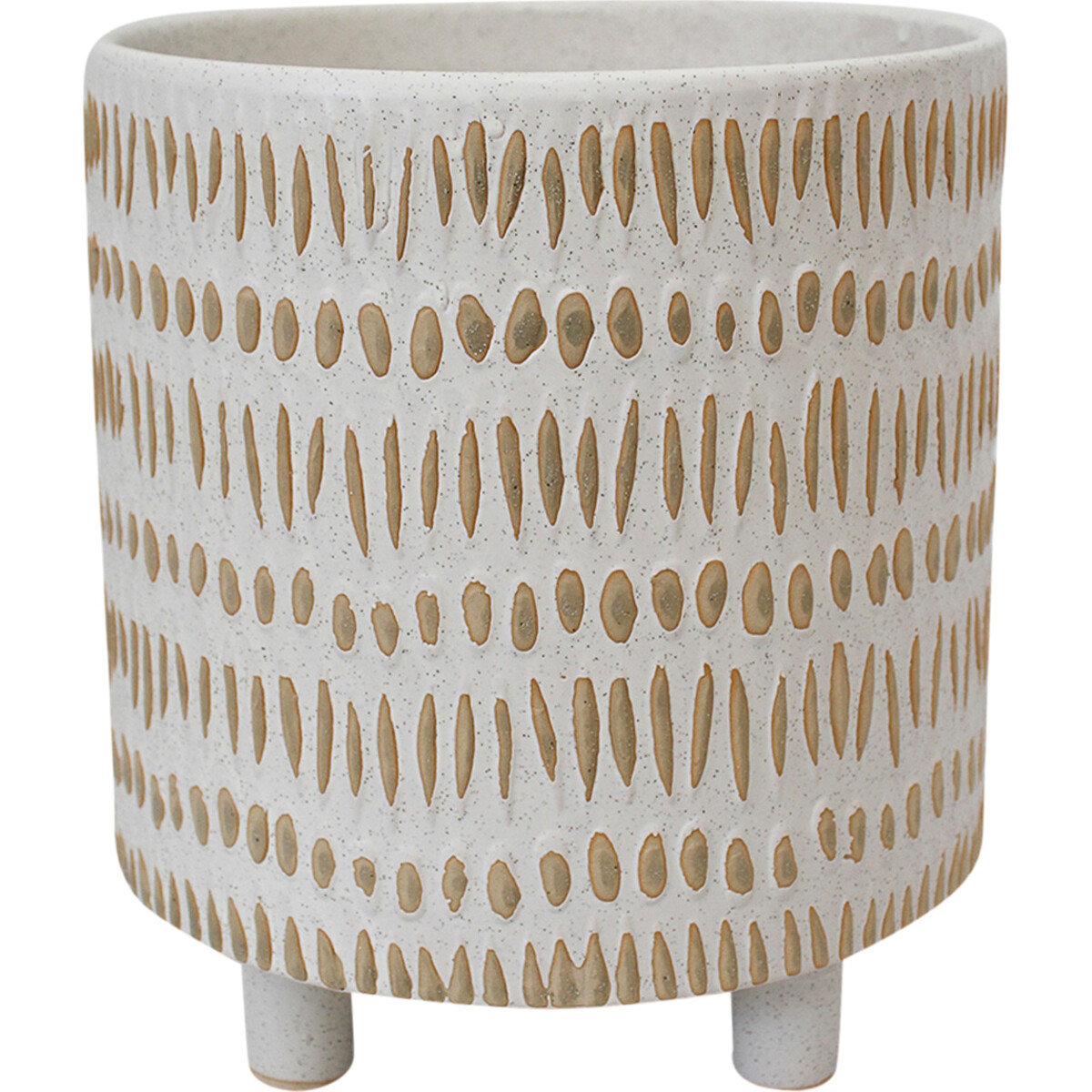 The Planter Java Natural Medium is a classic planter crafted from top quality ceramics in such moderate size measuring 15 centimetres in length and 15 centimetres in breadth. It stands on four sturdy legs at a height of 15.5 centimetres. On the body of this cylindrical shaped planter are short, vertical markings in sandy brown colour.