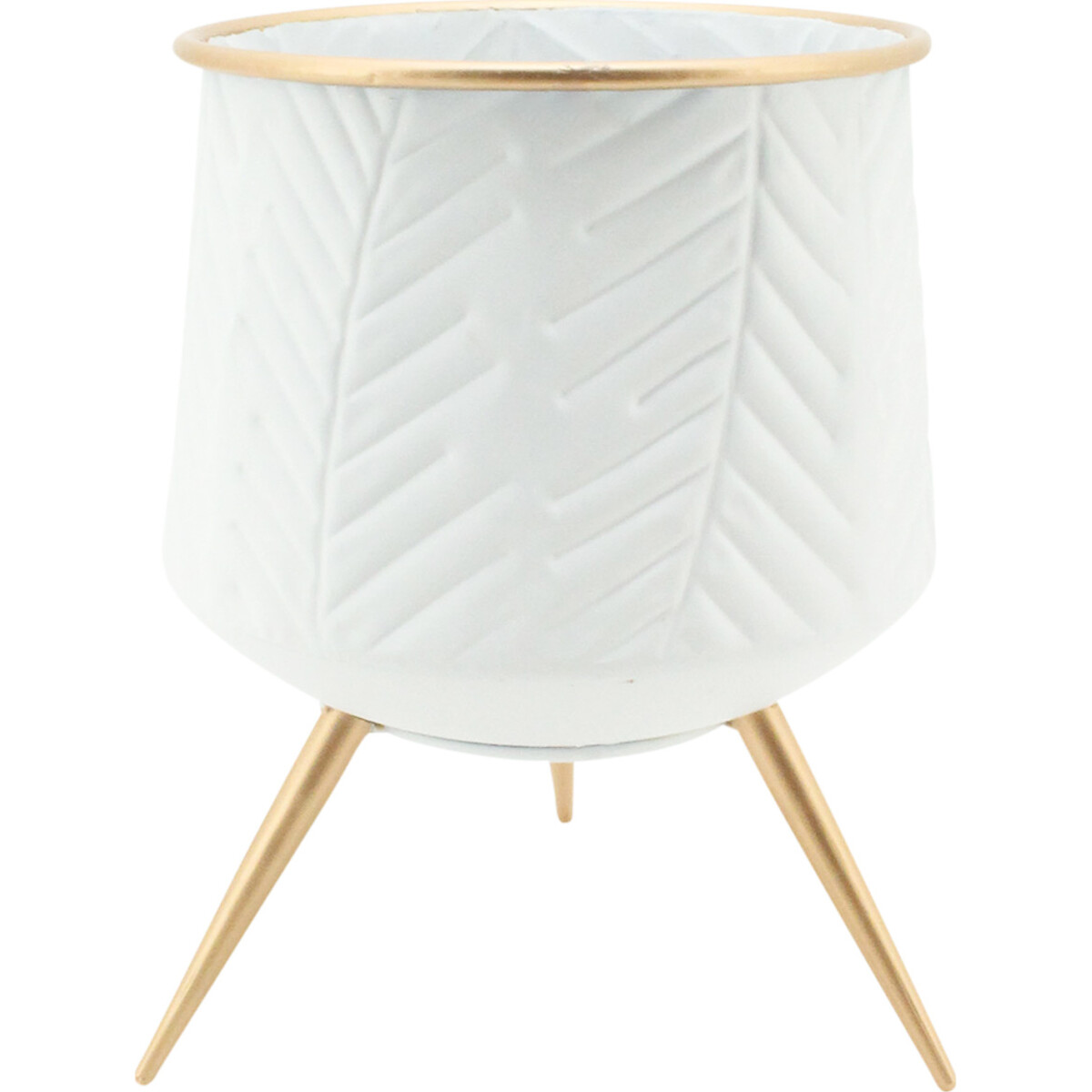 Elaborately lacquered in a stark white palette and featuring ornately imprinted patterns of leaves on its bright surface, the Planter Leaf White/Gold Short is nothing short of sophisticatedly charming! This planter features a pot that is made using superior quality metal which partly accounts for its cup-like shapeliness and the possibility of the beautifully imprinted leaf patterns. It is then painted richly in an unsullied bright white colour while its rim is coated in a thin layer of gold. It is also supported by a gold painted metallic tripod.