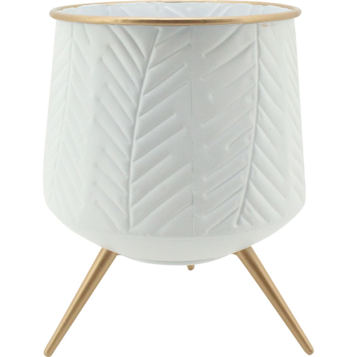Considering the three evenly spaced metallic stands which are attached to the base of this pot, it is no wonder that this ornate beauty stands at an impressive height of 37 centimetres. The planter and its attached tripod stand are made wholly of high grade metal. The design features a planter crafted in the alluring shape of a cup only that this is bigger with a wideness measuring 28 centimetres and a length measuring the same 28 centimetres. The body is then imprinted with leaf patterns which look even more conspicuously appealing with the choice of white lacquer and gold coated rim.