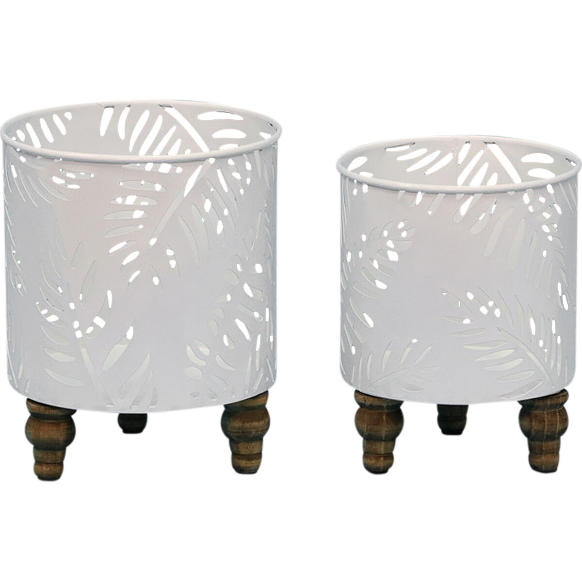 Supported by four 100% natural wooden sturdy stands, the Planter Leaves Timber Feet White S/2 is a set of two planters that can be placed on just about any flat surface wide enough to contain it. The choice of material combination and palette gives these planters multiple decorative ornamentations. It is made of metallic material which is painted in pristine white giving every decorative setting where this planter is used a contemporary aesthetic enhancement. At the same time, the use of nature infused motif achieved by the leaf patterns combines with the brown coloured wooden stands to give every décor setting a rustic ornamental appeal at the same time.
