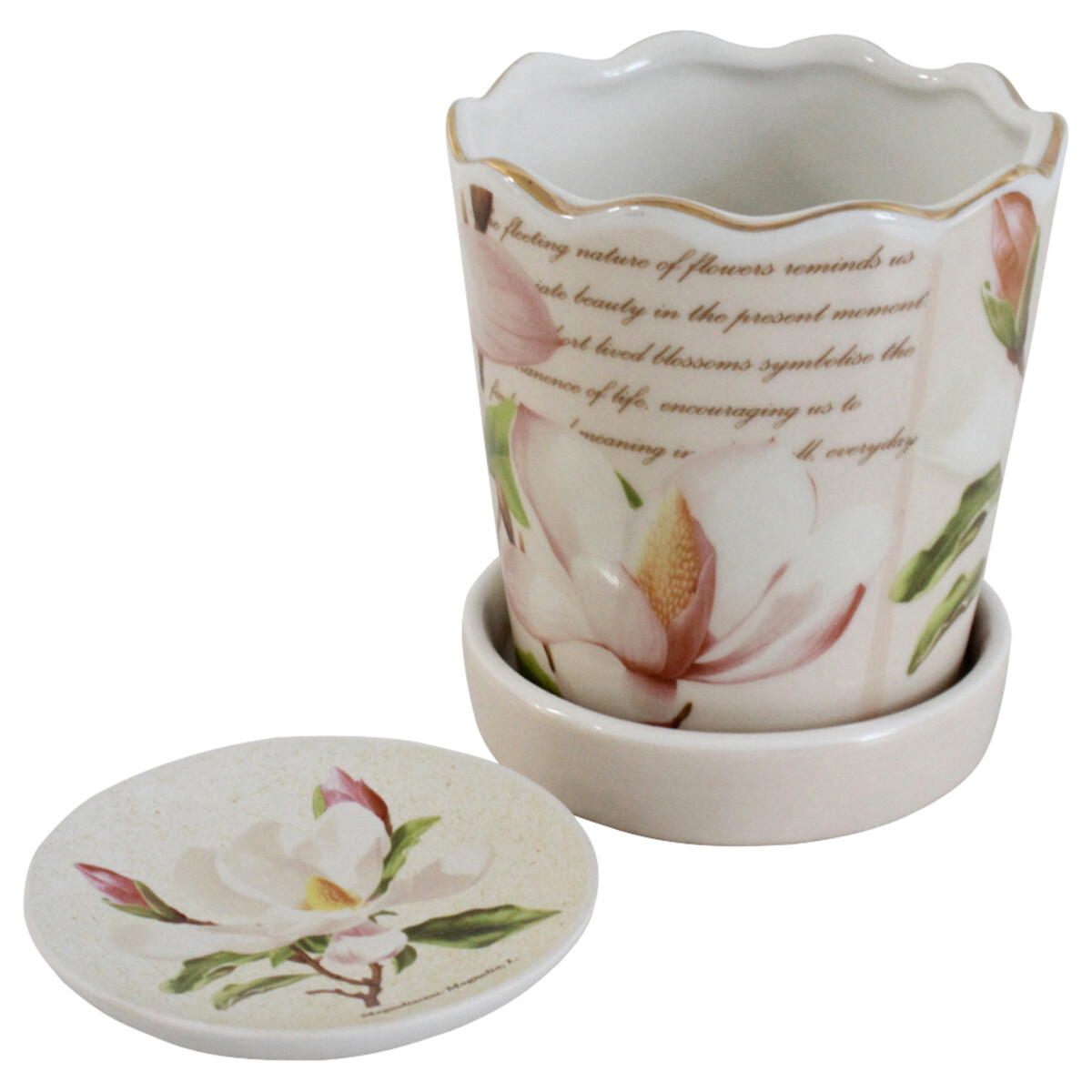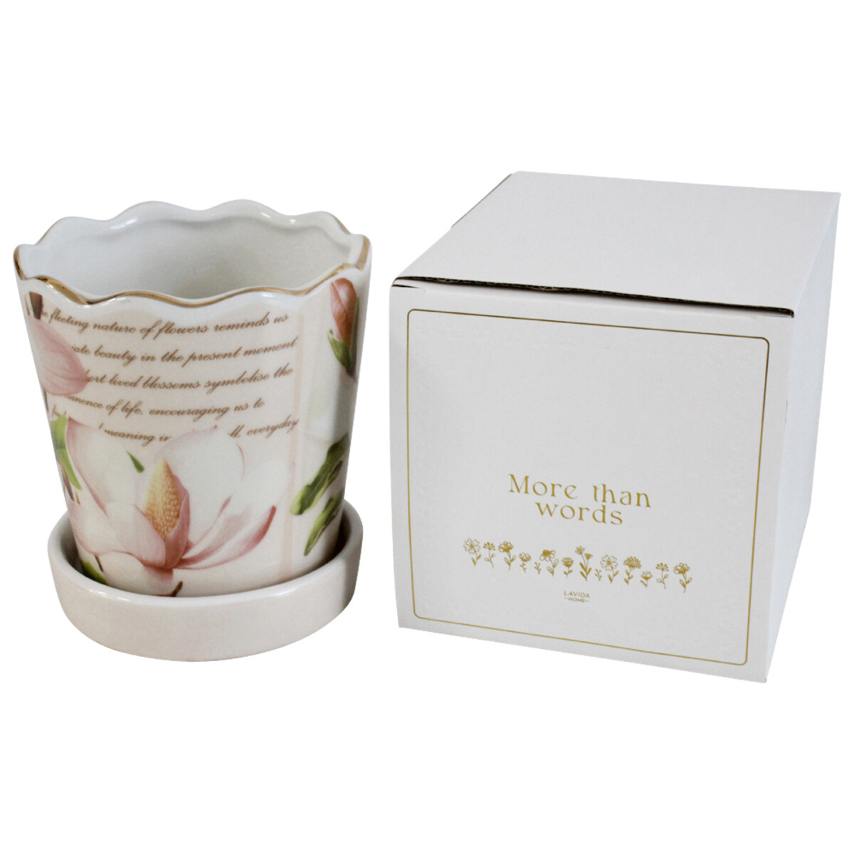 The magnolia bloom on this one is beautifully printed with a painterly touch - something many shoppers will notice straight away. The gentle colour palette means it fits a bunch of interior styles, from classic to modern farmhouse and even soft pastels in boho-inspired spaces. The removable saucer does come in handy for dealing with drainage or for keeping things neat if your customers want to use it as a decorative organiser. And there's something about the slightly scalloped rim that really adds a little extra magic. This is one of those pieces that will make great gifts - and there’s no guessing what kind of decor it would go well with because, honestly, it looks good everywhere!