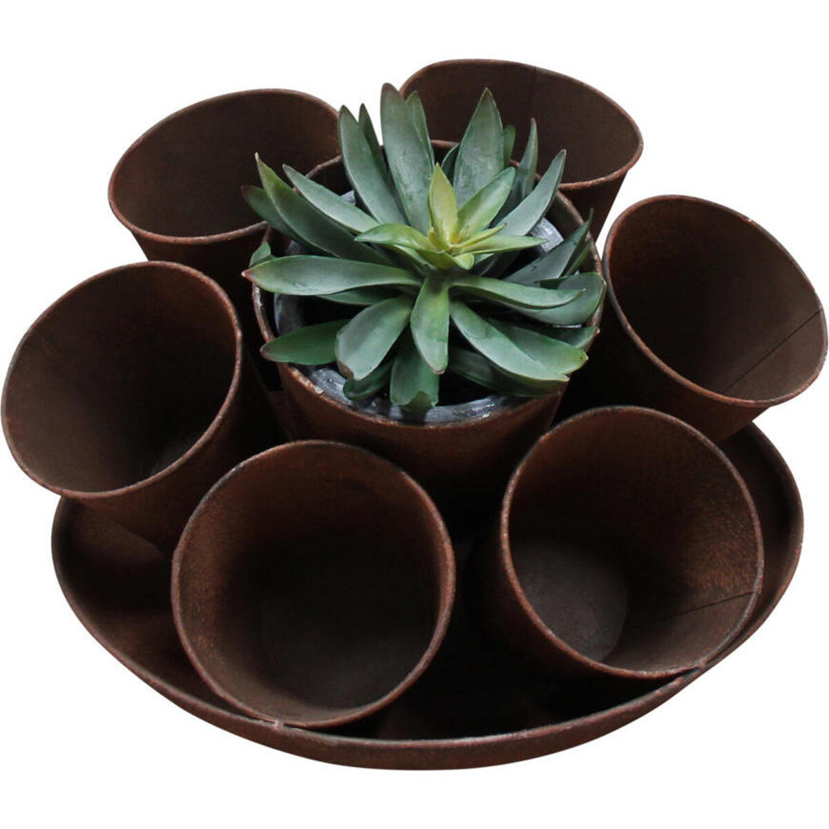 Making a display with plants for your exteriors or your home interiors in possible with this fascinating little multi chamber planter that comes with one central bowl surrounded by several others which could be used to create quite an interesting arrangement. Six tilted metal planters surround the central ne thus adding to the design that could be created. Perhaps you could place a plant that grows a lot taller than the ones on the periphery and this way not intimidate the one in the centre. Or perhaps you could create quite a bouquet of varying flowers that could all form part of one single arrangement when they all have blooms. Something surely one can look forward to. You could also use this planter for growing herbs or ornamental shrubs. The metal roundel is all of 32 cm in total height with a width also of the same - approximately 31 cm. This arrangement thus will be well balanced without there being any fear of the planter toppling over. Of course, it - goes without saying that plants would have to be pruned and kept within a certain size to maximize on the loom of the arrangement that comes naturally with the design. All you need to do is choose what you wish to place there.